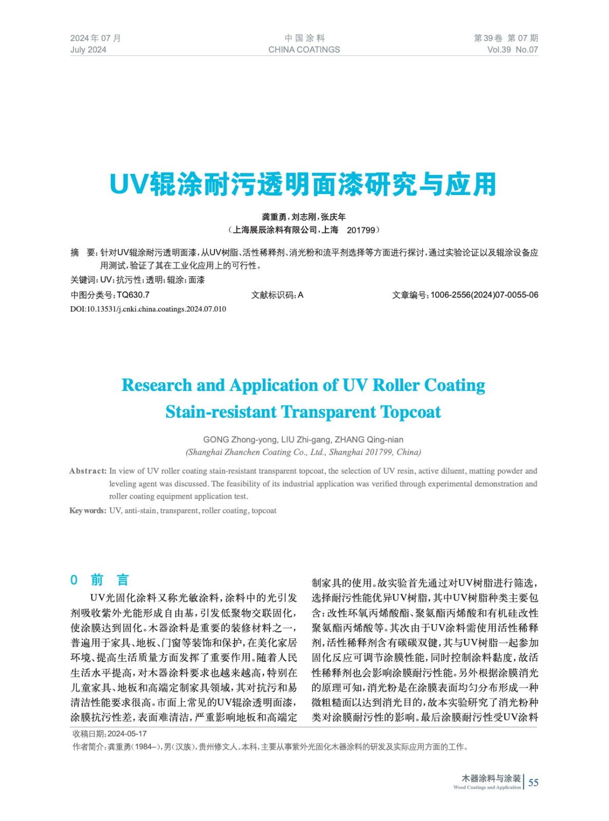 摘要:對UV輥涂耐污透明面漆,從UV樹脂、活性稀釋劑、消光粉和流平劑選擇等方面進行探討,通過實驗論證以及輥涂設(shè)備應用測試,驗證了其在工業(yè)化應用上的可行性。