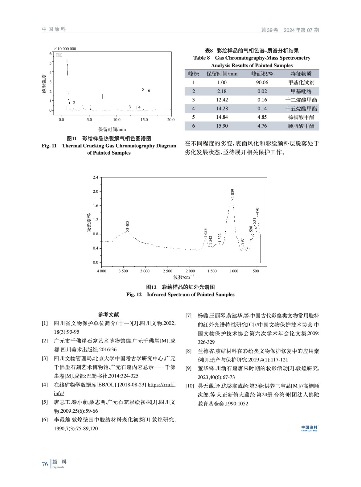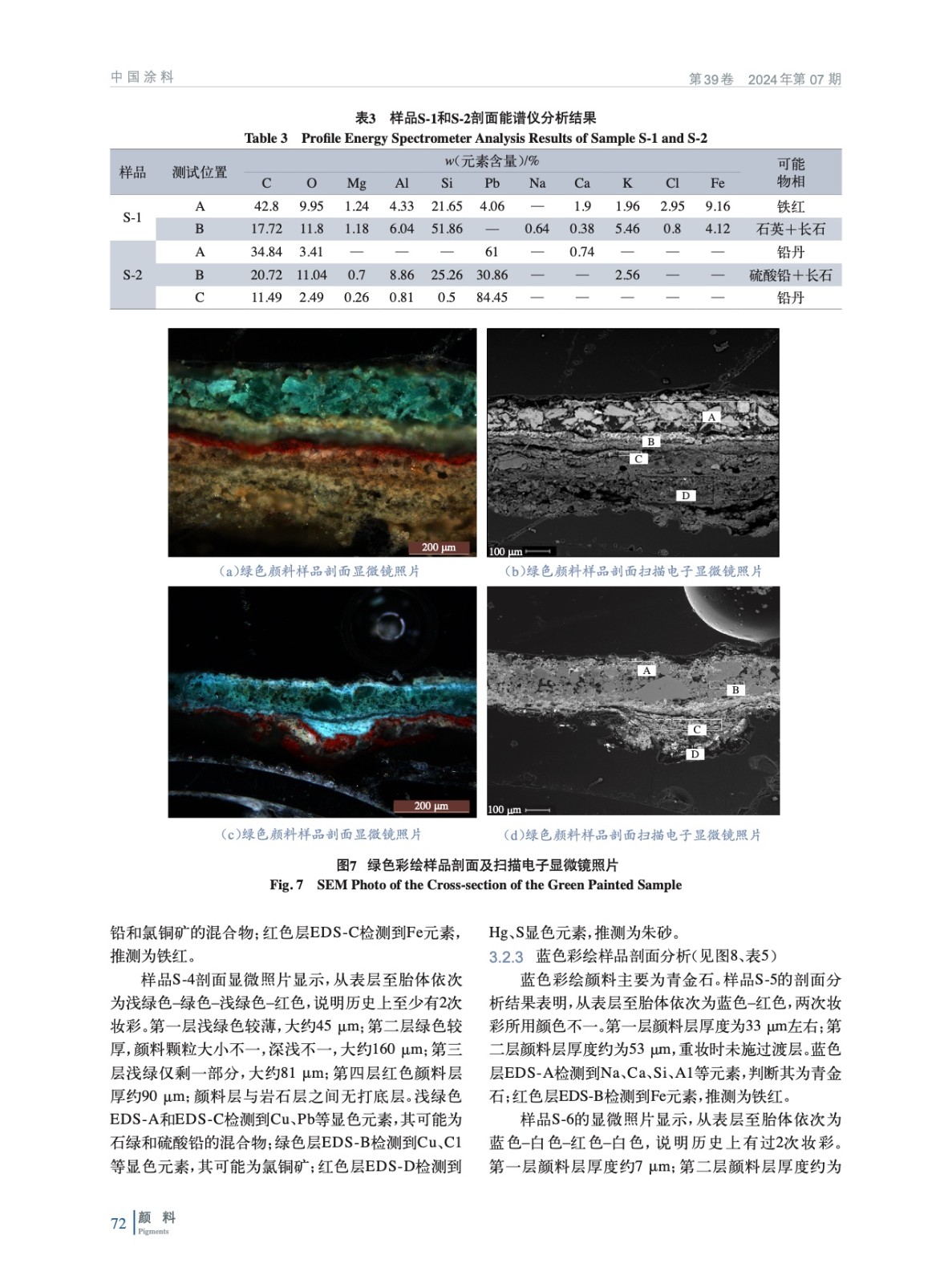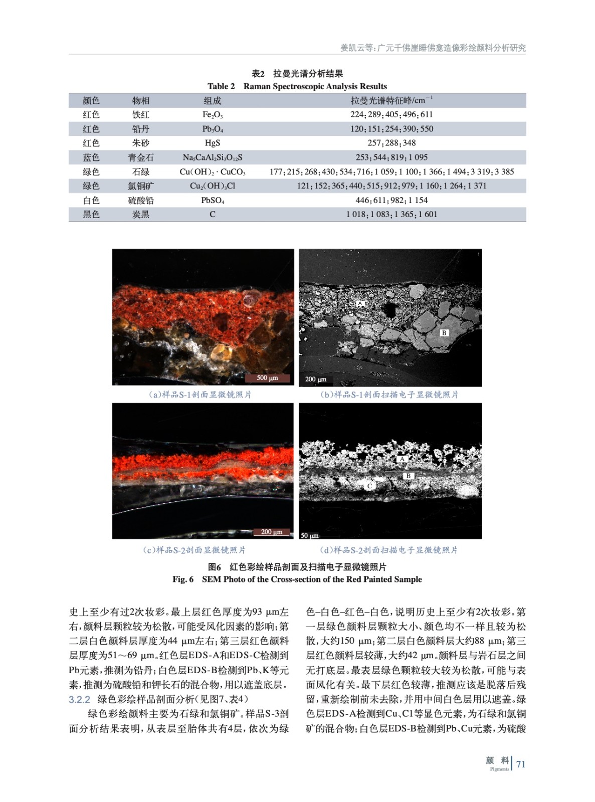 摘要:睡佛龕開鑿于唐高宗末至武周時期,造像多次妝彩。以睡佛龕造像彩繪為研究對象,應(yīng)用Raman、XRF、XRD、SEM-EDS、PY-GC-MS等多種檢測方法對彩繪顏料層進(jìn)行分析研究,結(jié)果表明:歷史上造像妝彩多達(dá)3次,彩繪紅色顏料為鐵紅、鉛丹、朱砂,藍(lán)色顏料為青金石,綠色顏料為堿式氯化銅、石綠,白色顏料為硫酸鉛,黑色顏料為炭黑,膠結(jié)材料為動物膠。該研究成果為后續(xù)保護(hù)修復(fù)工作提供了科學(xué)依據(jù)。
