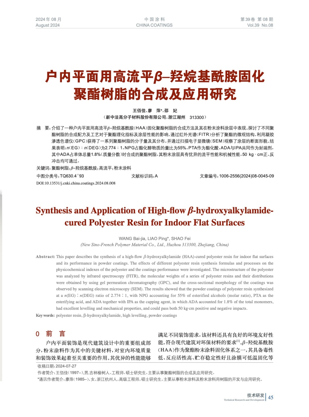 戶(hù)內(nèi)平面用高流平β–羥烷基酰胺固化聚酯樹(shù)脂的合成及應(yīng)用研究