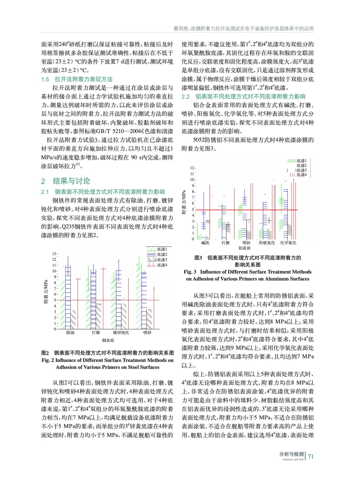 摘要:采用拉開法對(duì)艦載電子裝備上常用的Q235鋼和5052防銹鋁表面的底漆涂膜的附著力進(jìn)行拉開法定量測(cè)試,對(duì)同種基材的不同表面處理方式對(duì)同種底漆涂膜附著力的影響進(jìn)行比較,同時(shí)也對(duì)比了4種底漆在相同基材和表面處理時(shí)的附著力差異。通過拉開后的截面圖和底漆本身的特性解釋了附著力差異的原因,給出了Q235鋼和5052防銹鋁表面不同表面處理方式時(shí)的底漆選用建議。
