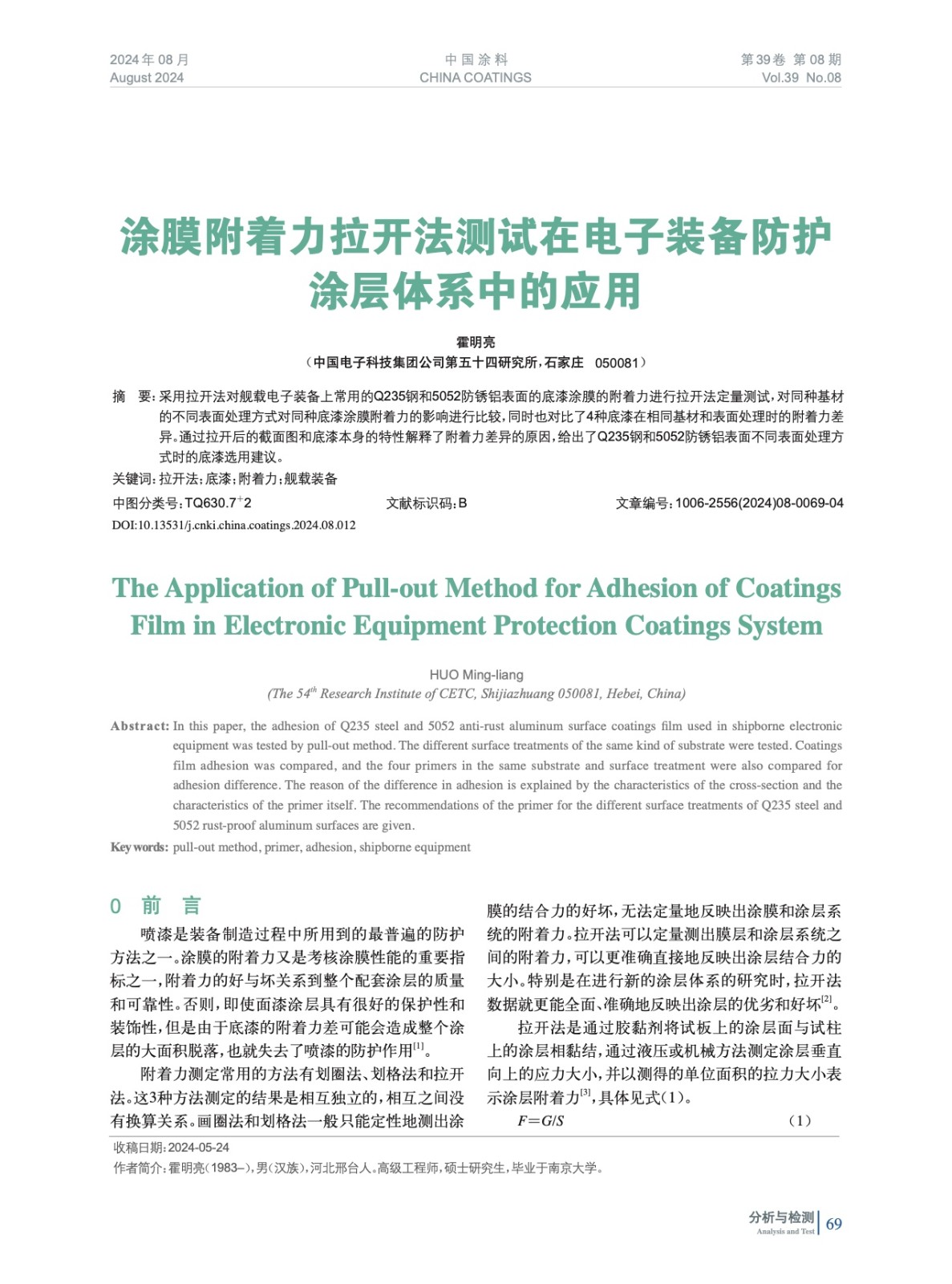 涂膜附著力拉開法測(cè)試在電子裝備防護(hù)涂層體系中的應(yīng)用