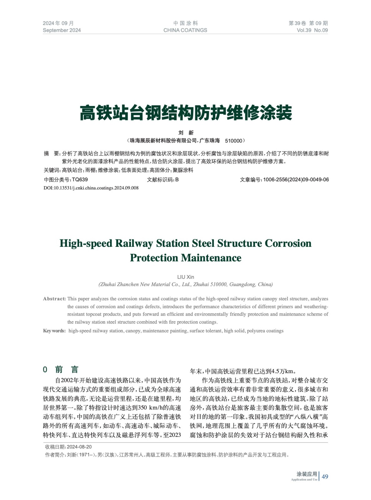 摘要:分析了高鐵站臺上以雨棚鋼結(jié)構(gòu)為例的腐蝕狀況和涂層現(xiàn)狀,分析腐蝕與涂層缺陷的原因,介紹了不同的防銹底漆和耐紫外光老化的面漆涂料產(chǎn)品的性能特點,結(jié)合防火涂層,提出了高效環(huán)保的站臺鋼結(jié)構(gòu)防護維修方案。