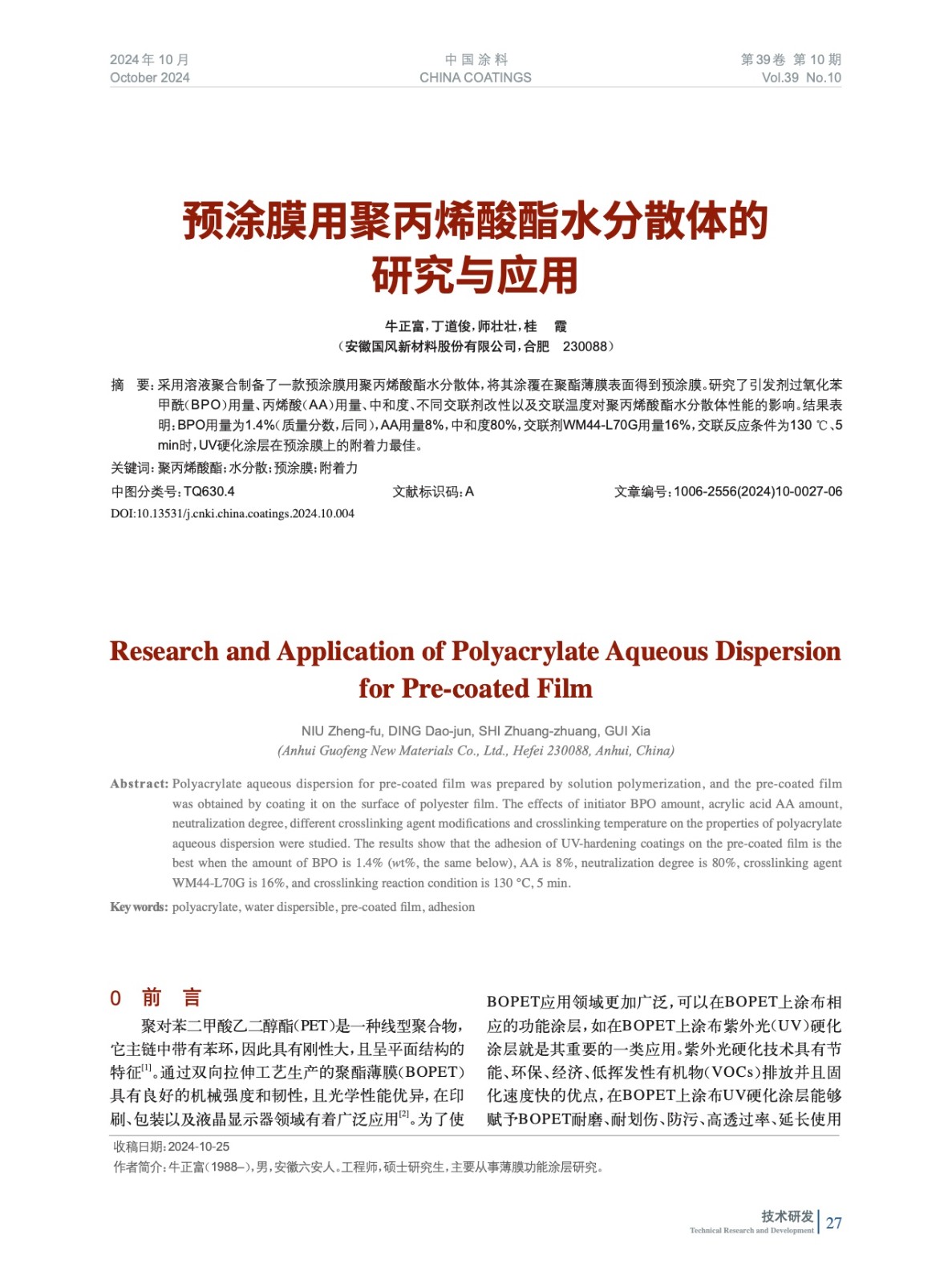 預(yù)涂膜用聚丙烯酸酯水分散體的研究與應(yīng)用