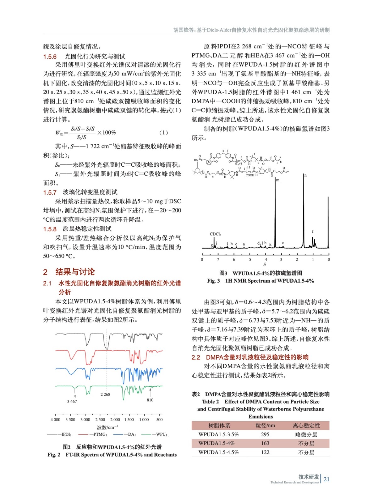 摘要:為了制備環(huán)境友好型自修復(fù)自消光涂層,采用Diels-Alder (DA)二元醇作為自修復(fù)單元和硬段、聚四氫呋喃作為軟段,結(jié)合2,2-二羥甲基丙酸(DMPA)親水鏈段與丙烯酸酯基光固化基團(tuán)制備了基于DA水性光固化聚氨酯樹脂。利用FT-IR對(duì)產(chǎn)物結(jié)構(gòu)和涂層固化過程中碳碳雙鍵轉(zhuǎn)化率進(jìn)行了表征,研究了DMPA含量與DA二元醇含量對(duì)樹脂乳液粒徑和穩(wěn)定性及涂層自修復(fù)和自消光等性能的影響。結(jié)果表明:隨著DMPA含量增加,乳液粒徑減小、穩(wěn)定性增加;涂層光澤度先降后升。另外,隨DA二元醇含量增加,乳液粒徑增加、光固化時(shí)碳碳雙鍵轉(zhuǎn)化率降低、涂層光澤度降低、自修復(fù)性能先升后降。其中當(dāng)DMPA質(zhì)量分?jǐn)?shù)為4%、樹脂結(jié)構(gòu)中含有1.5 mol的DA二元醇結(jié)構(gòu)單元時(shí),乳液粒徑為163 nm,乳液離心穩(wěn)定,涂層光澤為27.6%,損壞涂層在150 ℃下基本修復(fù)。