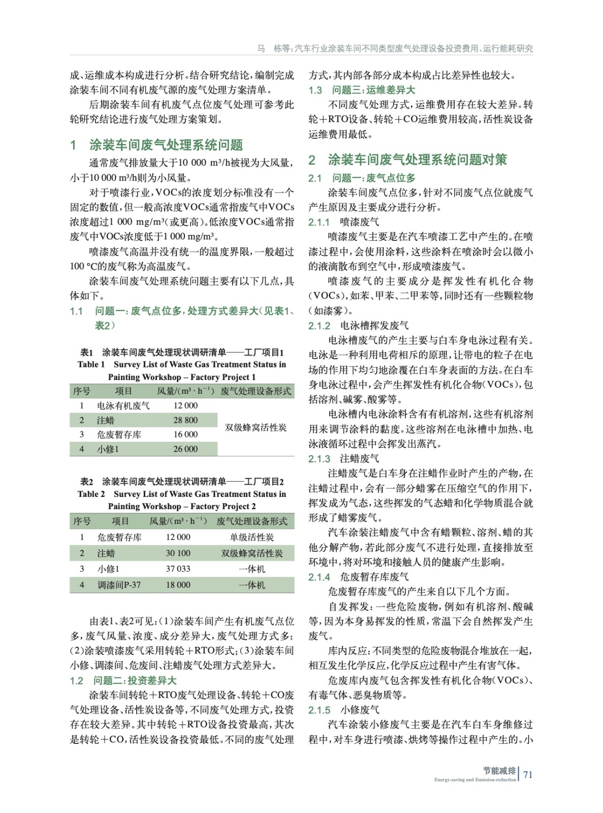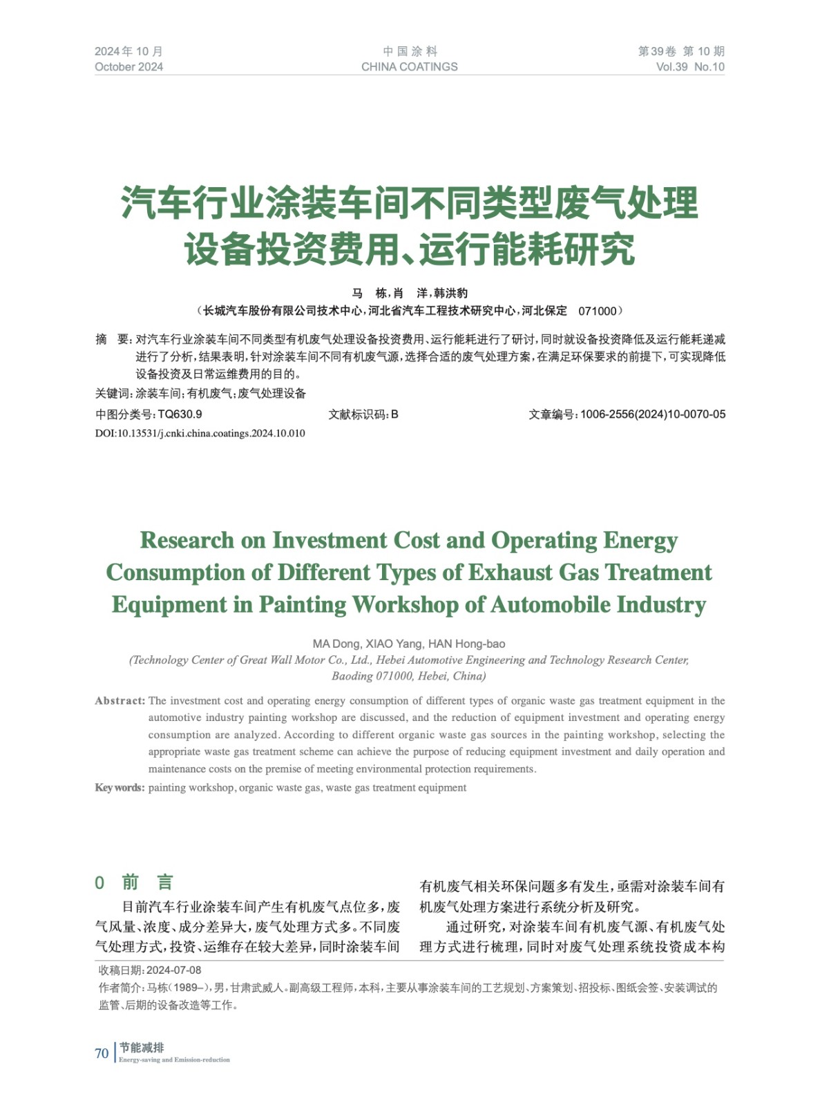 汽車(chē)行業(yè)涂裝車(chē)間不同類(lèi)型廢氣處理設(shè)備投資費(fèi)用、運(yùn)行能耗研究