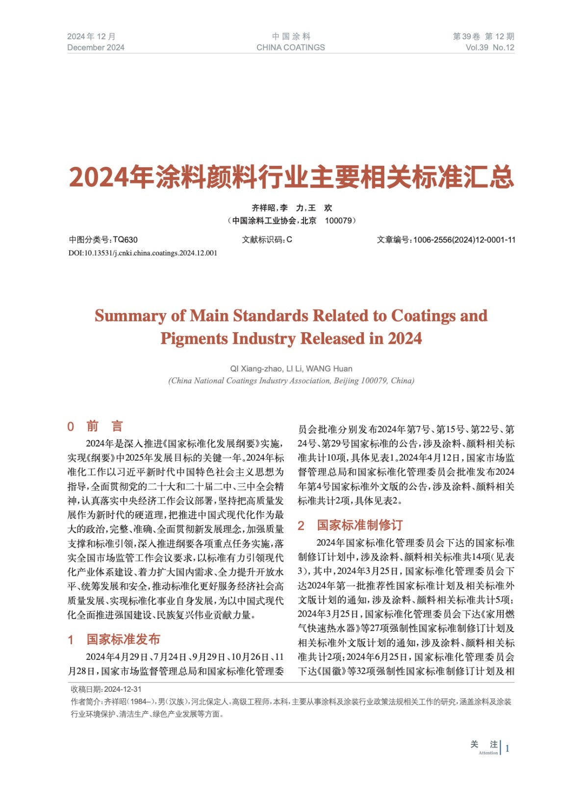 摘要:2024年,涂料標(biāo)準(zhǔn)化工作堅(jiān)持以習(xí)近平新時(shí)代中國特色社會主義思想為指導(dǎo),全面貫徹黨的二十大和二十屆二中、三中全會精神,立足新發(fā)展階段,完整、準(zhǔn)確、全面貫徹新發(fā)展理念,按照國家標(biāo)準(zhǔn)化相關(guān)文件要求,緊貼涂料技術(shù)發(fā)展趨勢和行業(yè)實(shí)際需求,踐行使命擔(dān)當(dāng),奮力開創(chuàng)涂料標(biāo)準(zhǔn)化工作新局面,為涂料產(chǎn)業(yè)高質(zhì)量發(fā)展提供堅(jiān)實(shí)支撐,涂料顏料相關(guān)標(biāo)準(zhǔn)得以進(jìn)一步完善。