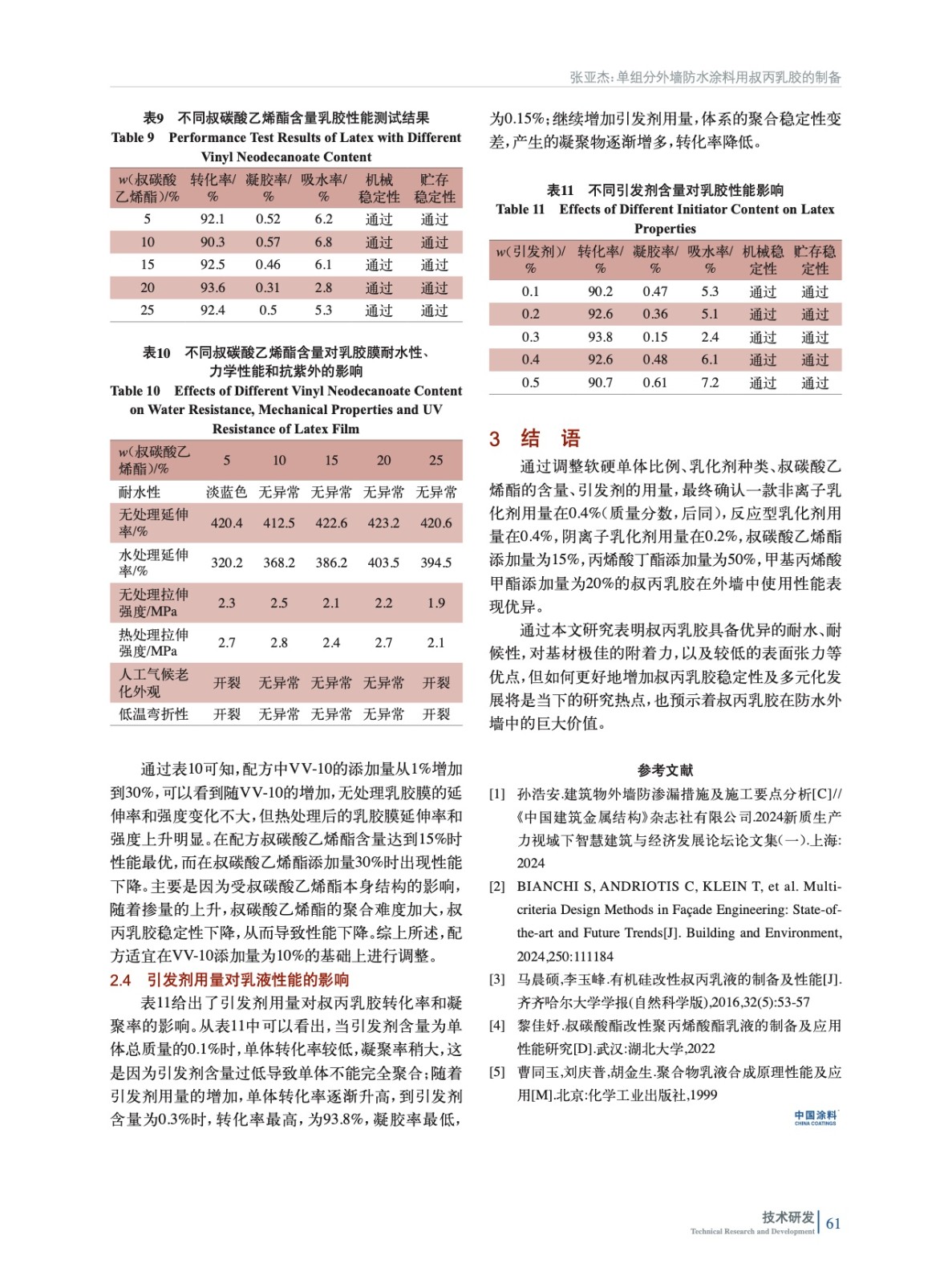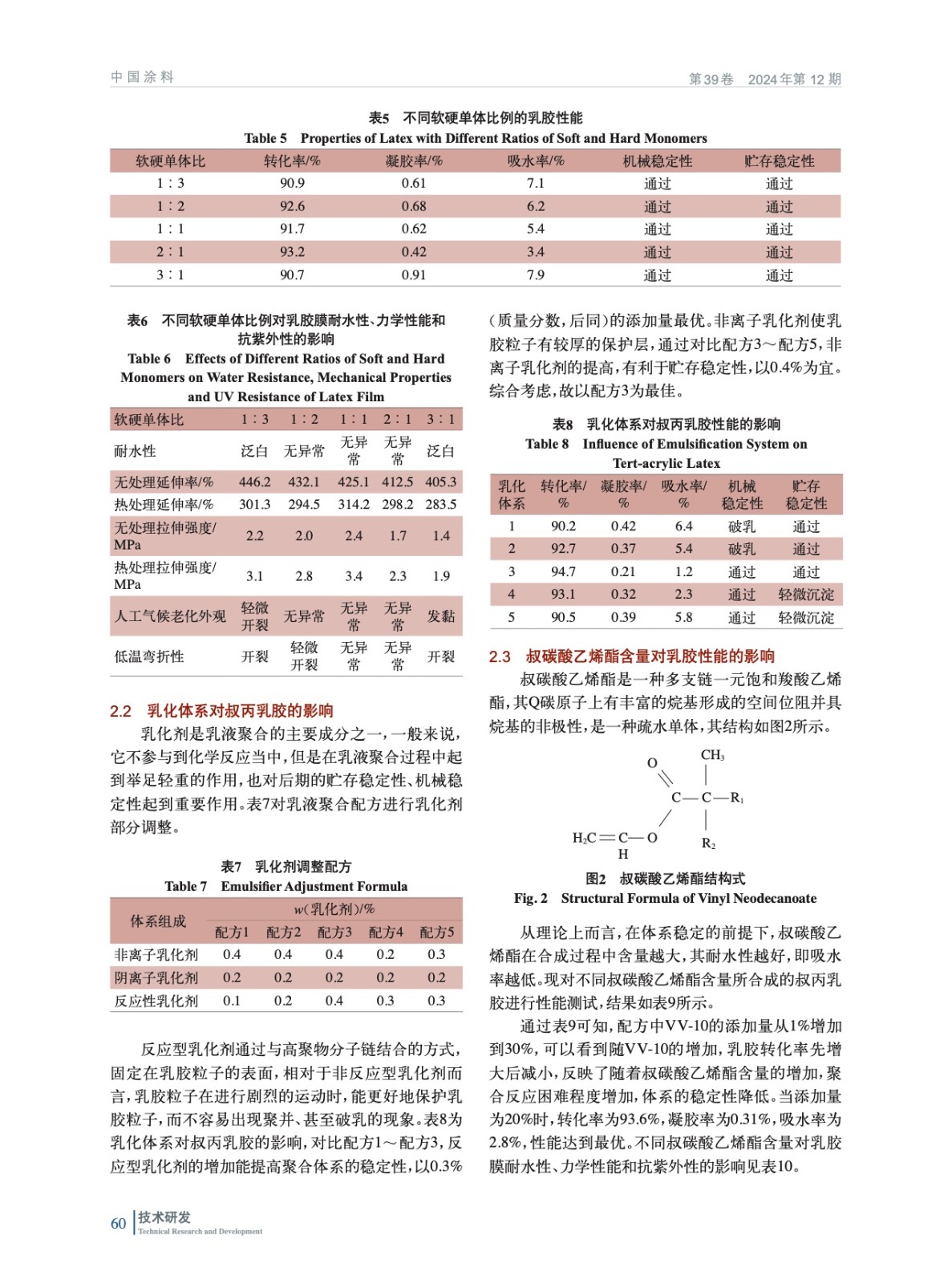 摘要:通過調(diào)整軟硬單體比例、乳化劑種類、叔碳酸乙烯酯的含量、引發(fā)劑的用量測(cè)試了乳膠力學(xué)、耐候和耐水等性能,制備出適用于建筑外墻的叔丙乳膠,對(duì)單組分叔丙乳膠制備具有一定的指導(dǎo)意義。
