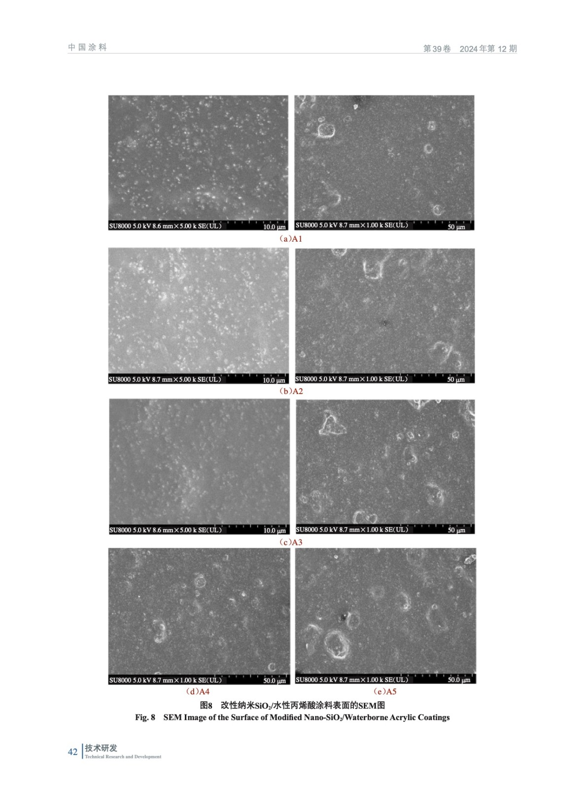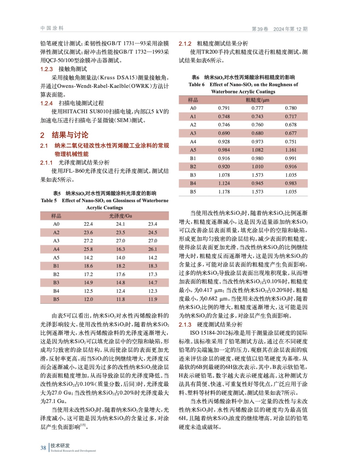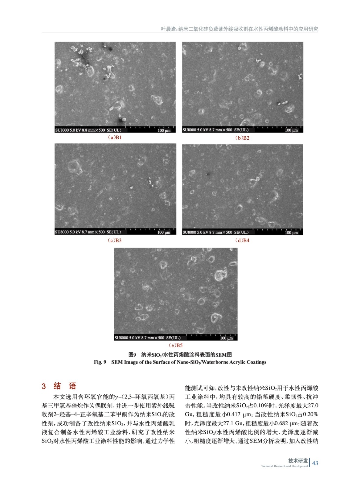 摘要:研究旨在制備負(fù)載紫外線的納米二氧化硅(SiO2)改性的水性丙烯酸工業(yè)涂料,并研究改性納米SiO2含量對(duì)涂料性能的影響。采用了接觸角儀、掃描電鏡、常規(guī)物理機(jī)械性能等對(duì)多種手段對(duì)涂膜進(jìn)行表征。研究結(jié)果表明,隨著改性納米SiO2含量的增加,涂層具有較好的常規(guī)物理機(jī)械性能,并且光澤度有所提高。這表明,改性納米SiO2對(duì)涂料的增韌和增強(qiáng)效果顯著,能夠改善涂層的常規(guī)物理機(jī)械性能和表面性能。然而,當(dāng)改性納米SiO2含量達(dá)到一定值時(shí),增加含量并不能繼續(xù)提高涂層的光澤度,甚至?xí)?dǎo)致涂層表面性能變差。這是因?yàn)?,改性納米SiO2在涂層中的分散度和填充效果受到含量的影響,達(dá)到一定含量后,納米SiO2顆粒之間的互相聚集和堆積現(xiàn)象會(huì)加劇,使涂層的表面質(zhì)量受到損害。