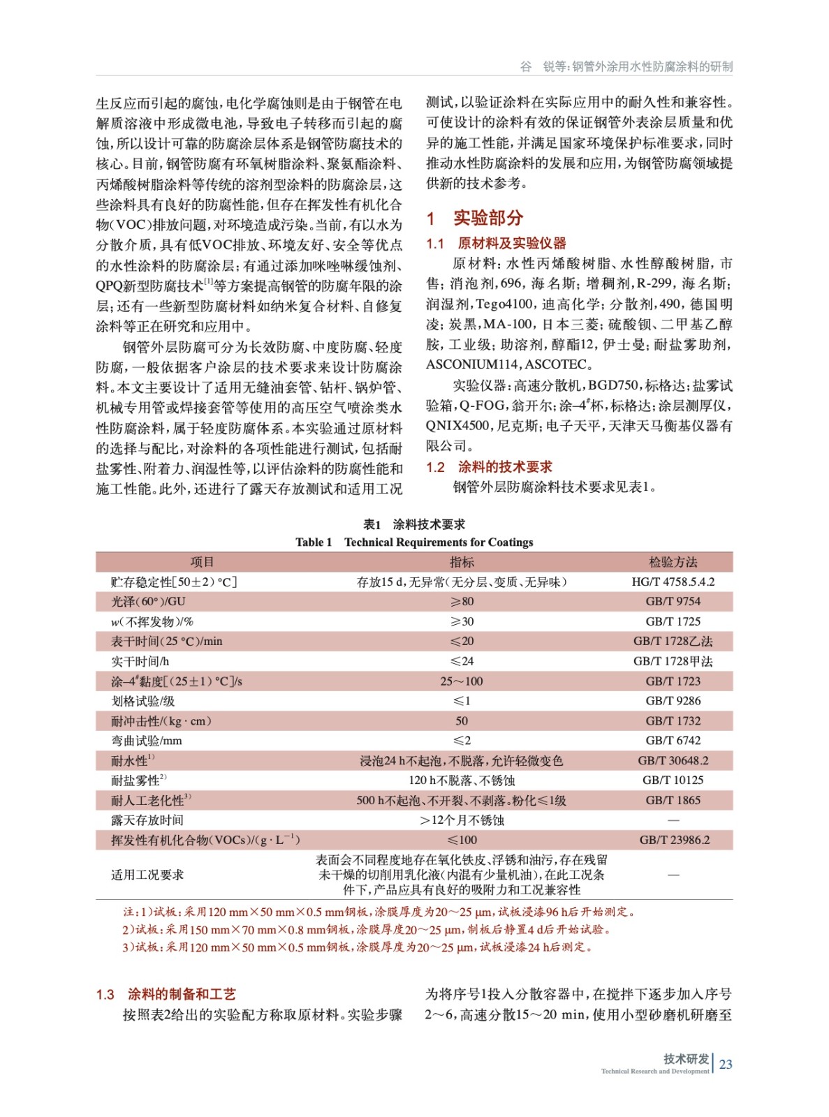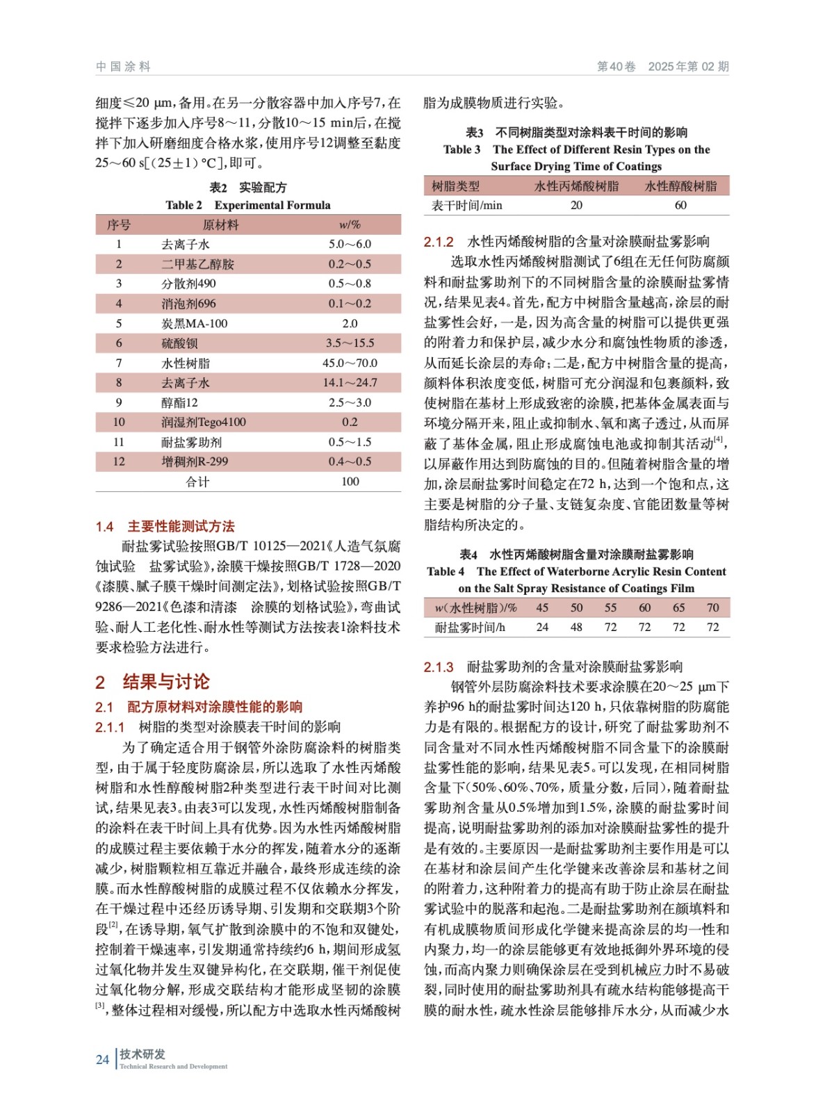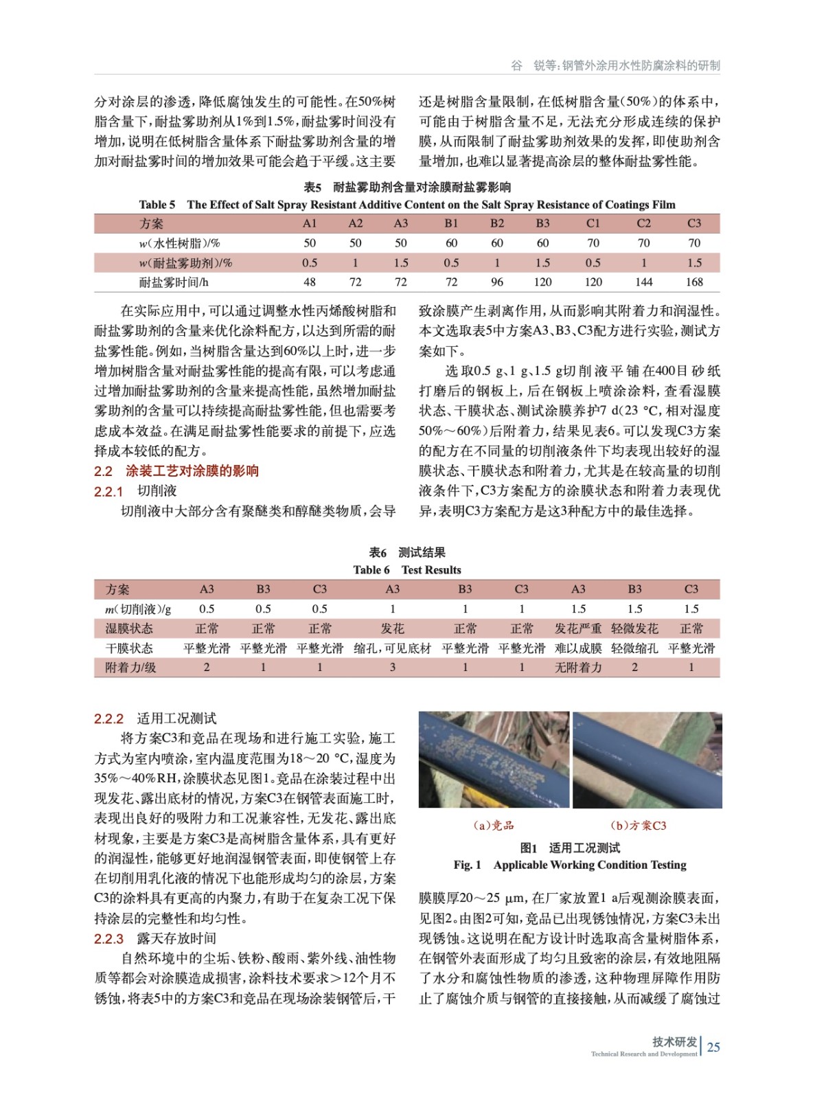 摘要:研制了一種適用于鋼管外涂的水性輕防腐涂料,并對其技術(shù)要求進(jìn)行了介紹。先通過樹脂類型的表干時間對比確定了使用主要成膜物質(zhì)為水性丙烯酸樹脂,然后通過改變水性丙烯酸樹脂和耐鹽霧助劑在配方中的添加量,評估其對涂膜耐鹽霧性能的影響,并測試了切削液對涂膜潤濕性、附著力的影響。研究結(jié)果表明,方案C3滿足技術(shù)要求,且在鋼管上殘留未干燥的切削用乳化液的施工條件下,表現(xiàn)出良好的吸附力、工況兼容性和防腐能力。