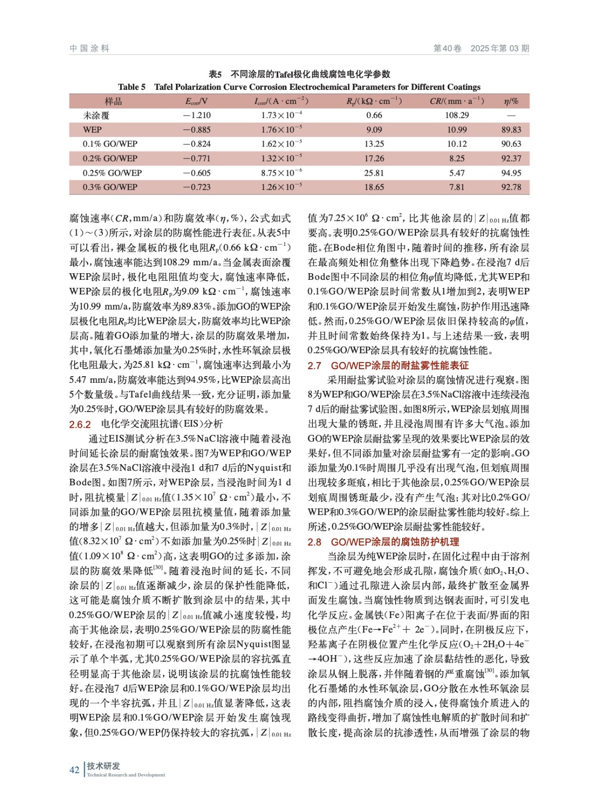 摘要:采用改進(jìn)的Hummer’s方法制備氧化石墨烯(Graphene Oxide,GO)納米材料,通過X-PS和SEM測(cè)試結(jié)果表明:二維片層結(jié)構(gòu)GO表面含有較多的含氧官能團(tuán)。然后制備氧化石墨烯水性環(huán)氧涂料(GO-WEP),探究不同含量氧化石墨烯對(duì)水性環(huán)氧樹脂涂層性能影響。與空白WEP涂層進(jìn)行性能對(duì)比,添加量為0.25%(質(zhì)量分?jǐn)?shù),后同)GO水性環(huán)氧涂層表面形貌平整,GO在涂層表面分散均勻,提高WEP涂層致密性;附著力可達(dá)到3.98 MPa,抗沖擊性為55 kg·cm,改善了WEP涂層的機(jī)械性能;通過電化學(xué)極化曲線和EIS阻抗測(cè)試表明:0.25%GO-WEP涂層與空白WEP涂層相比,防腐效率從89.83%提高至94.95%,|Z|0.01 Hz值可達(dá)到1.09×108 Ω·cm2;0.25%GO-WEP涂層表現(xiàn)出良好的防腐性能。