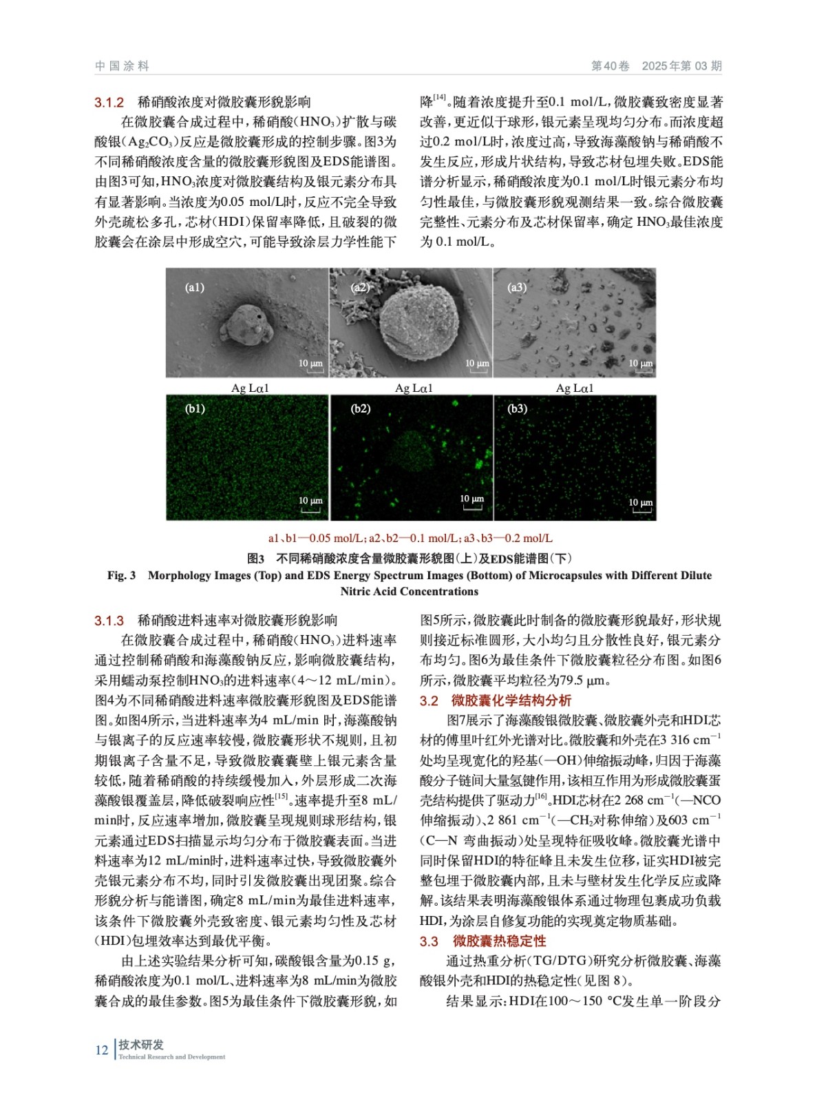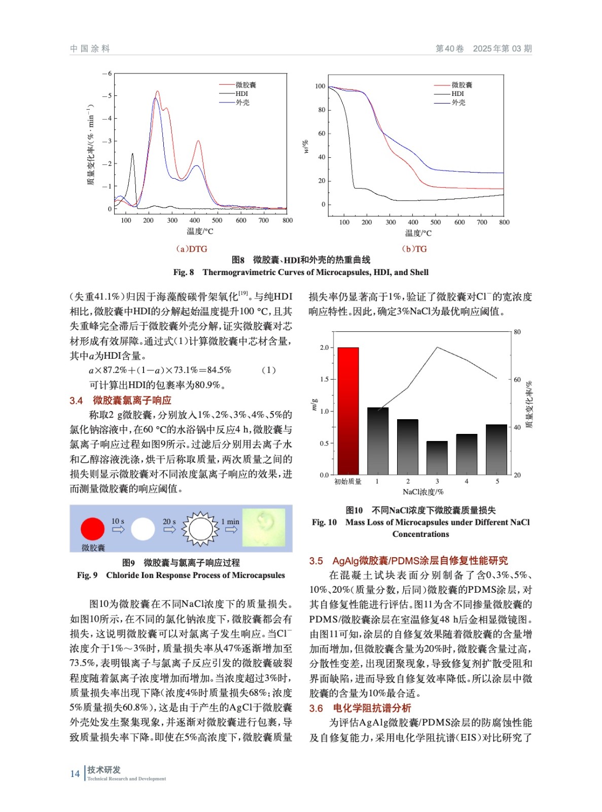 摘要:利用海藻酸鈉為壁材原料,六亞甲基二異氰酸酯為芯材原料,通過內源乳化法制備海藻酸銀(AgAlg)微膠囊,通過控制不同碳酸銀含量和稀硝酸濃度、進料速度探討了微膠囊最佳合成工藝,對微膠囊形貌、化學結構、熱穩(wěn)定性及芯材含量進行了研究,并通過微膠囊觸發(fā)微膠囊響應氯離子濃度進行表征。將微膠囊加入PDMS涂層,制備AgAlg微膠囊/PDMS自修復涂層,對其進行劃痕試驗和電化學阻抗分析,通過與PDMS涂層相對比,結果表明氯離子響應微膠囊具有較強的自修復能力。