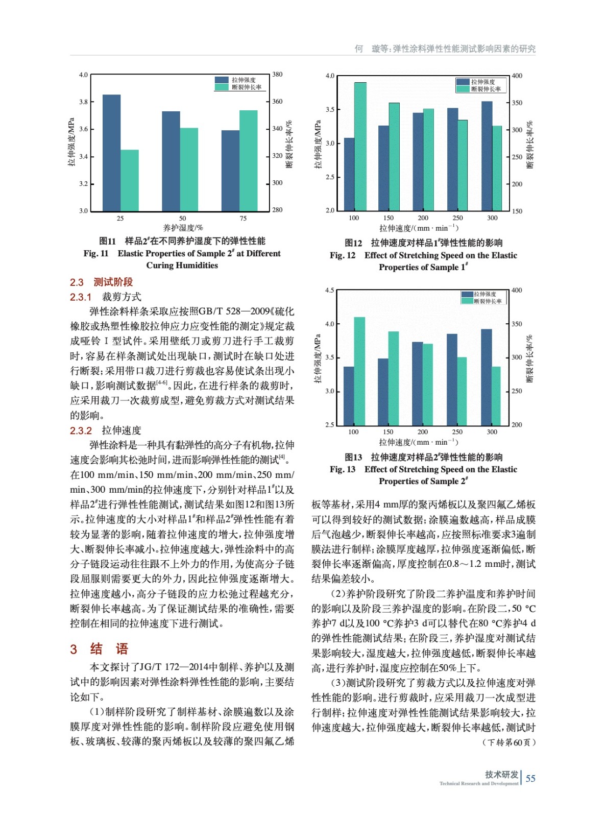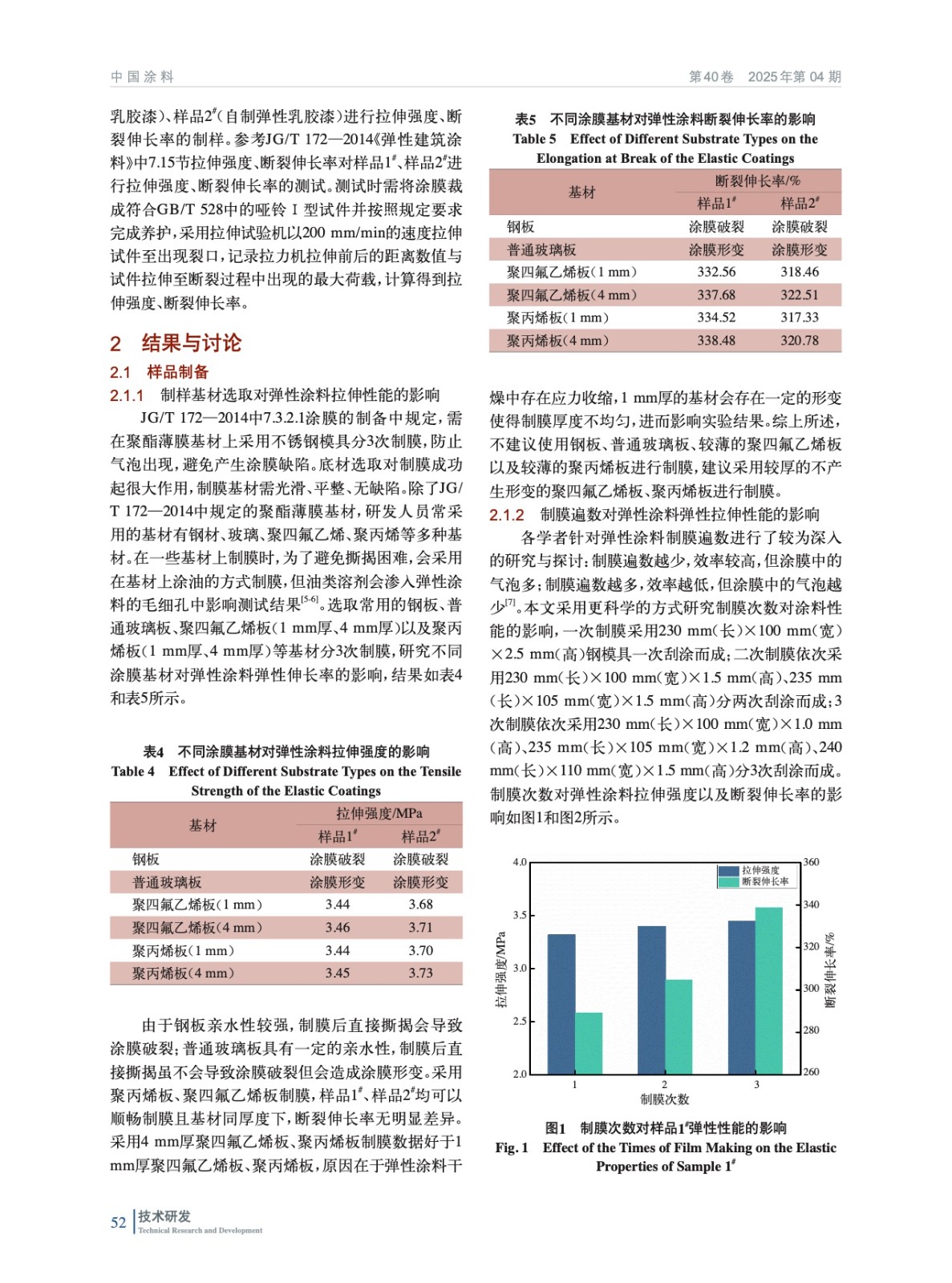 摘要:為了降低彈性涂料測試標準JG/T 172—2014《彈性建筑涂料》中的彈性性能測試誤差,針對制樣、養(yǎng)護以及測試階段對彈性性能測試影響因素進行探究。結果表明,制樣過程中需選擇合適的基材,嚴格控制制膜次數以及成膜厚度;養(yǎng)護過程中,需控制反面養(yǎng)護的養(yǎng)護溫度、養(yǎng)護時間以及測試前的養(yǎng)護濕度;測試過程中,需控制剪裁方式以及拉伸速度。針對制樣、養(yǎng)護以及測試階段進行嚴格控制,即可得到較為準確的彈性涂料彈性性能測試結果。