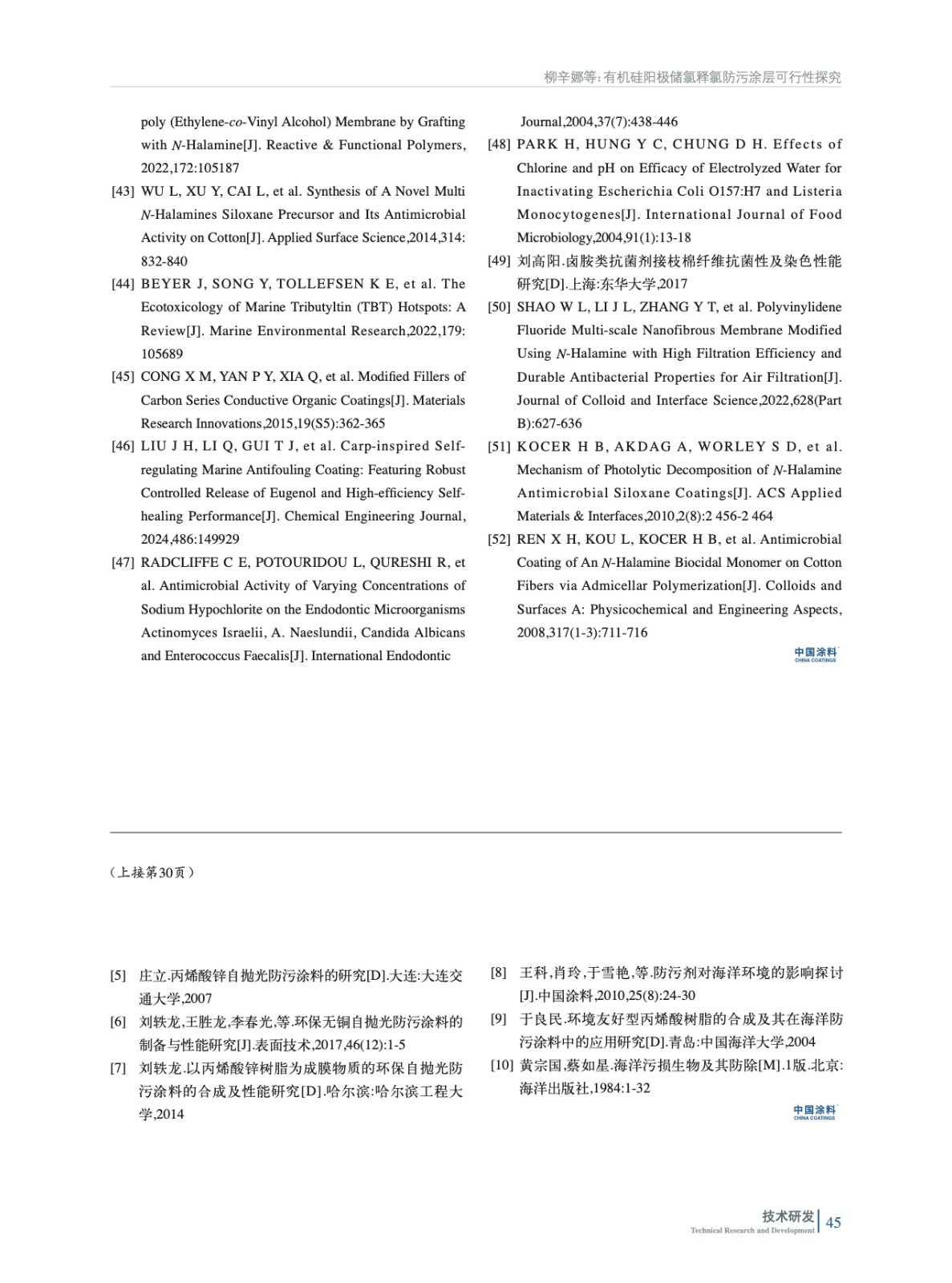 摘要:選取市場(chǎng)上常見的幾類靠防污劑釋放獲得防污效果的涂料進(jìn)行淡水浸泡后的開裂情況評(píng)價(jià),并采用幾款增韌物質(zhì)對(duì)涂料配方進(jìn)行改性。測(cè)試結(jié)果表明,在改性前,包括溶解型防污涂料、自拋光型防污涂料,均會(huì)在長(zhǎng)期淡水浸泡后,再次失水干燥時(shí)出現(xiàn)明顯的涂層開裂情況;而通過(guò)添加部分增韌物質(zhì)并進(jìn)行配方優(yōu)化后,可明顯提高防污涂層淡水浸泡后的抗開裂性能。同時(shí),在廈門海域進(jìn)行淺海浸泡試驗(yàn),表明增韌改進(jìn)后的防污涂料在淺海浸泡防污性能上沒有明顯變化,但改進(jìn)配方具備優(yōu)異的淡水浸泡后的抗開裂性能,可滿足我國(guó)淡水水域船廠的實(shí)際使用需要,減少淡水浸泡后防污涂層出現(xiàn)的開裂情況,具有較好應(yīng)用前景。