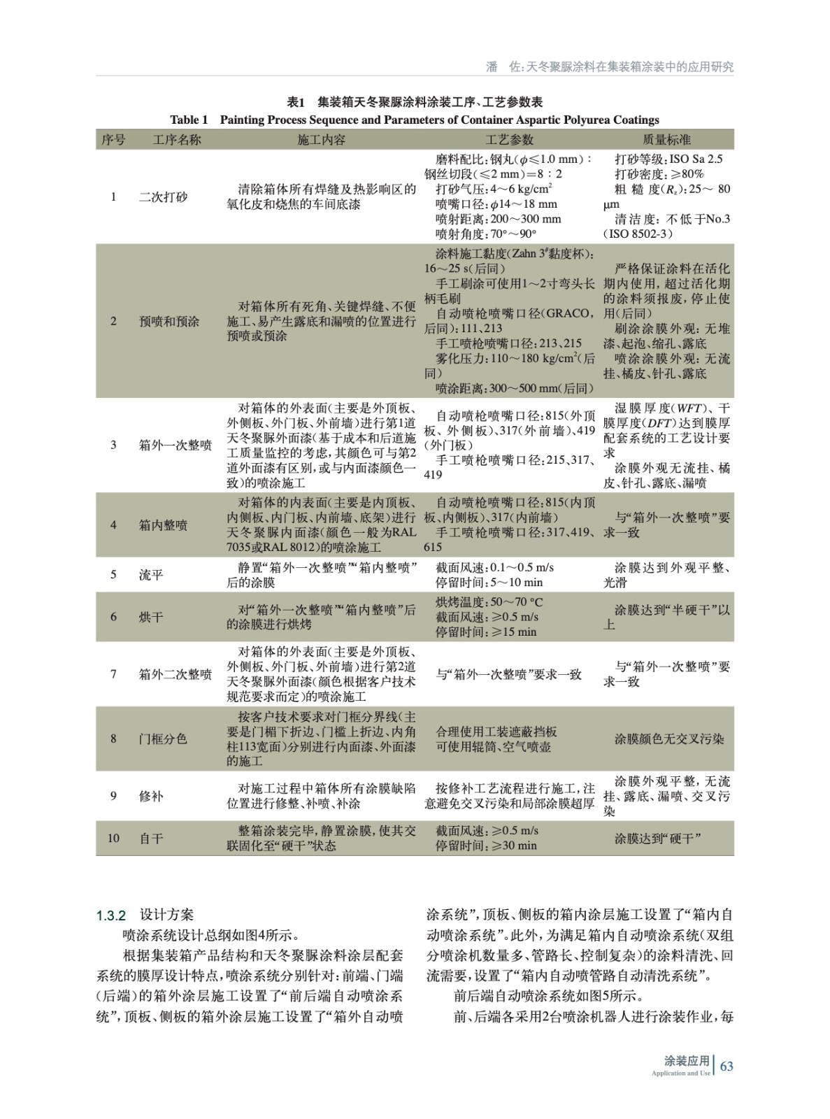 摘要:通過(guò)對(duì)天冬聚脲涂料在中集集裝箱的實(shí)際應(yīng)用情況進(jìn)行研究,從涂層配套系統(tǒng)的設(shè)計(jì)、涂裝工藝、涂裝設(shè)備、涂裝線技改、涂層質(zhì)量缺陷的控制等方面做深入分析,為集裝箱涂裝工藝的綠色升級(jí)提供了一條可供借鑒的解決方案和重要思路。