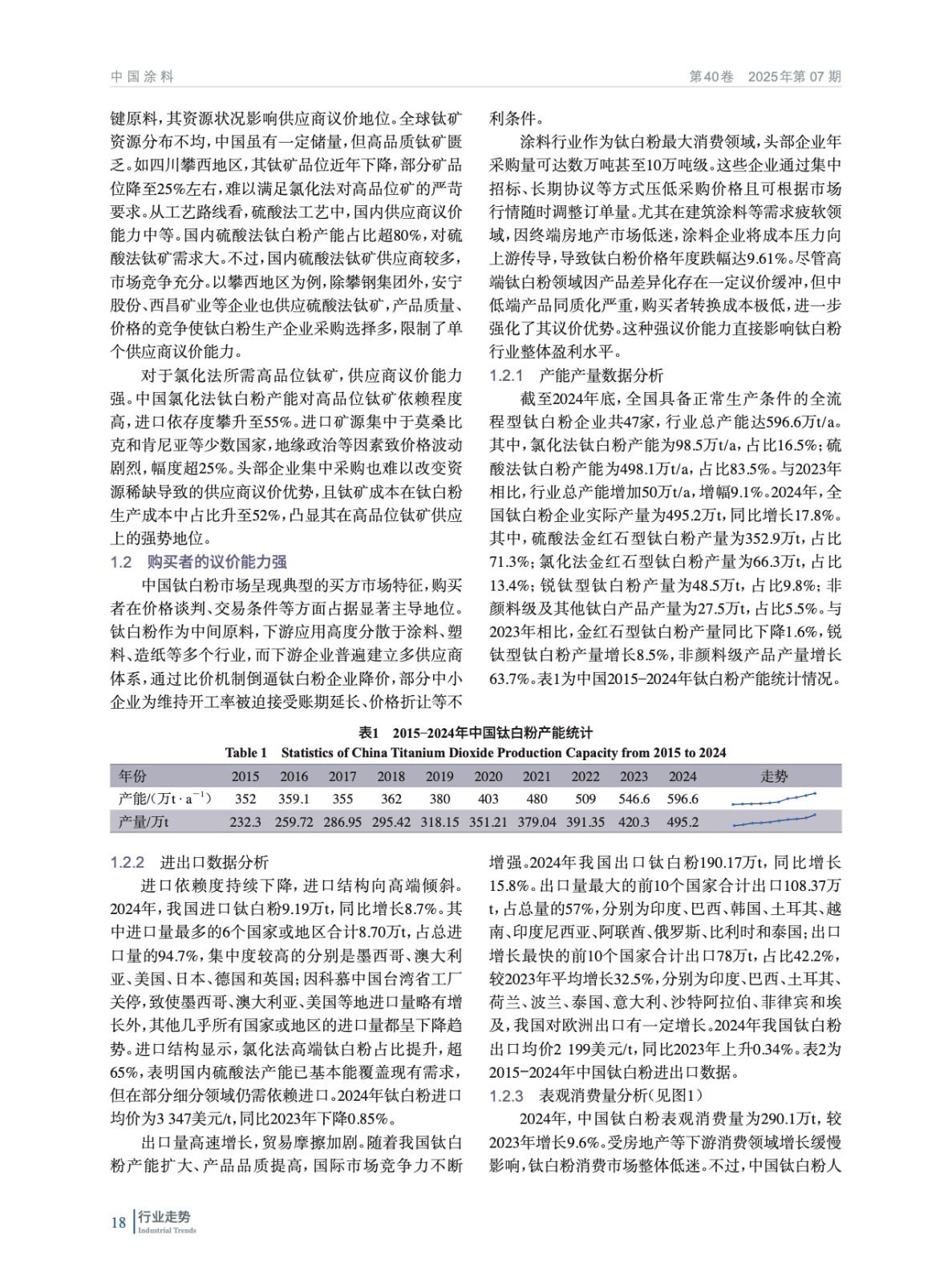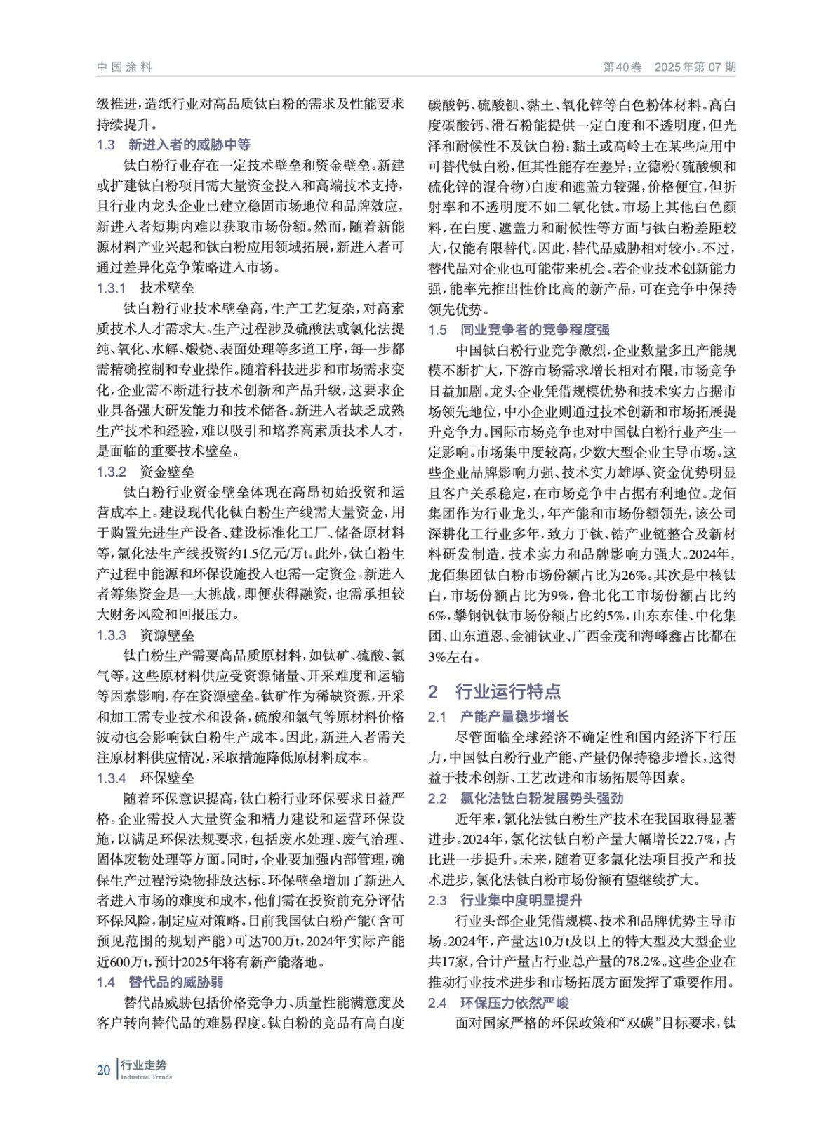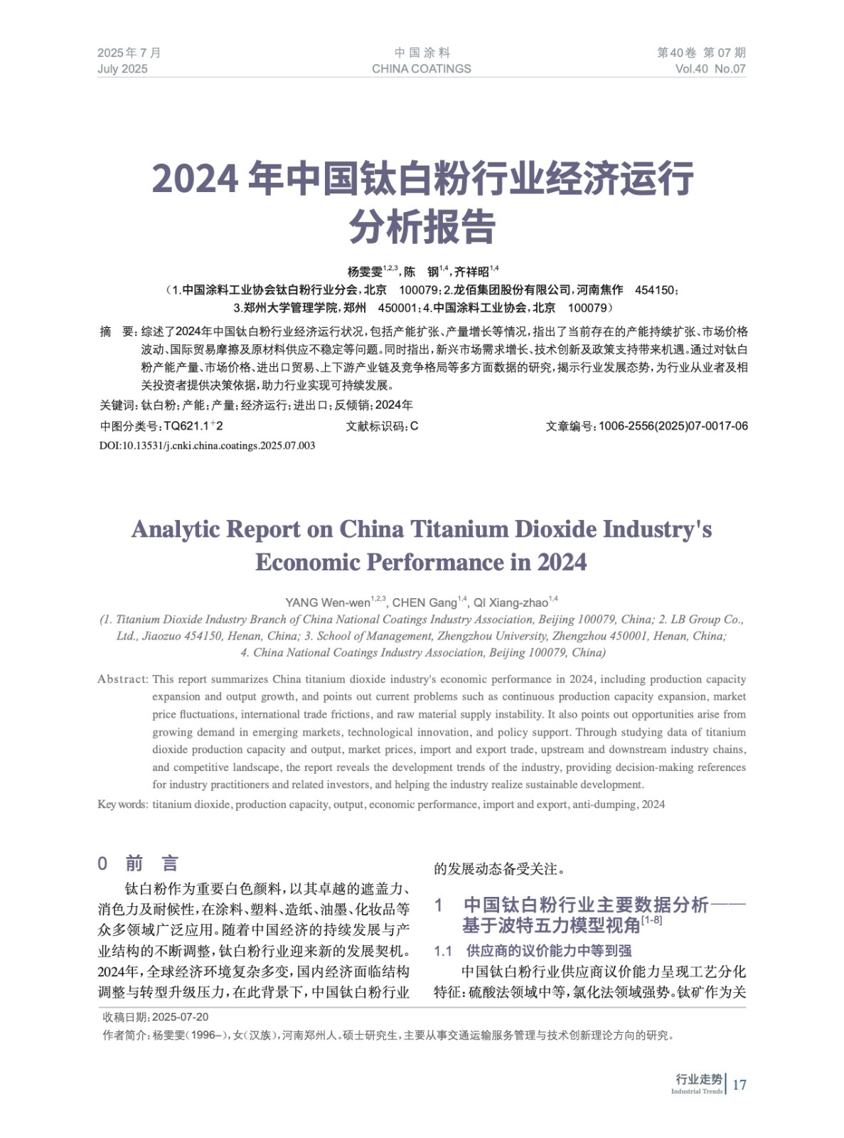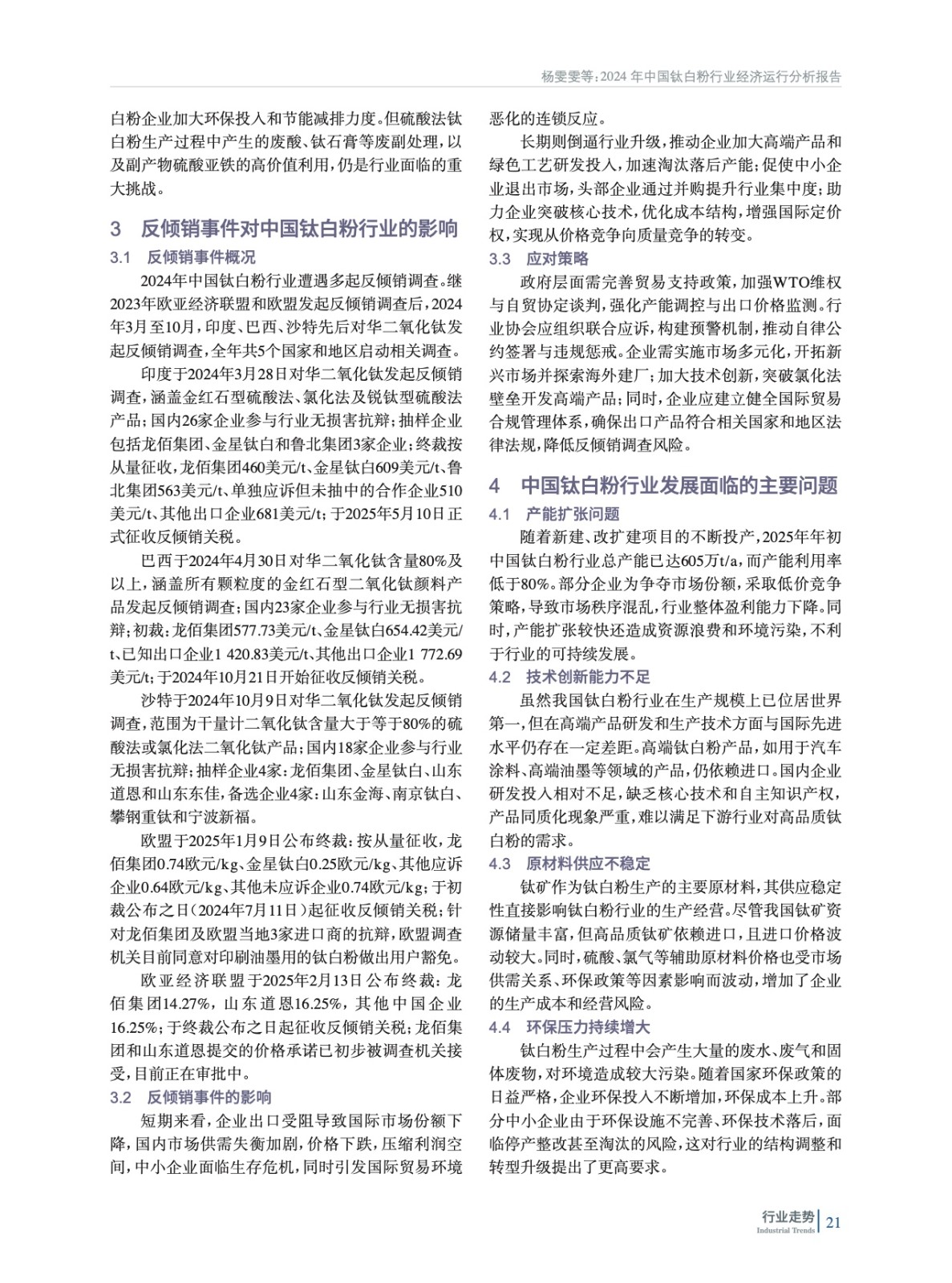 摘要:綜述了2024年中國(guó)鈦白粉行業(yè)經(jīng)濟(jì)運(yùn)行狀況,包括產(chǎn)能擴(kuò)張、產(chǎn)量增長(zhǎng)等情況,指出了當(dāng)前存在的產(chǎn)能持續(xù)擴(kuò)張、市場(chǎng)價(jià)格波動(dòng)、國(guó)際貿(mào)易摩擦及原材料供應(yīng)不穩(wěn)定等問(wèn)題。同時(shí)指出,新興市場(chǎng)需求增長(zhǎng)、技術(shù)創(chuàng)新及政策支持帶來(lái)機(jī)遇。通過(guò)對(duì)鈦白粉產(chǎn)能產(chǎn)量、市場(chǎng)價(jià)格、進(jìn)出口貿(mào)易、上下游產(chǎn)業(yè)鏈及競(jìng)爭(zhēng)格局等多方面數(shù)據(jù)的研究,揭示行業(yè)發(fā)展態(tài)勢(shì),為行業(yè)從業(yè)者及相關(guān)投資者提供決策依據(jù),助力行業(yè)實(shí)現(xiàn)可持續(xù)發(fā)展。