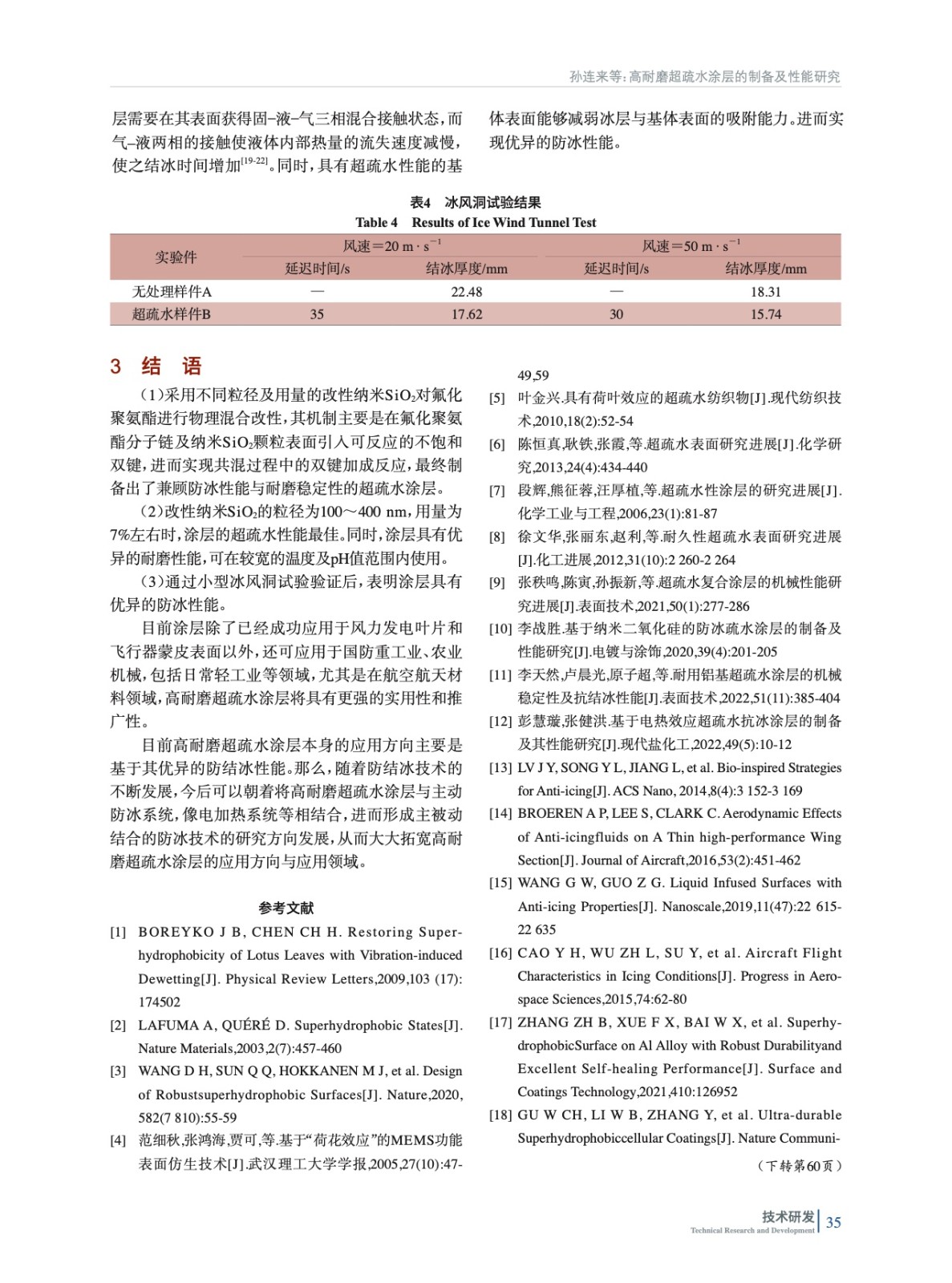 摘要:為了有效提高飛行器蒙皮表面涂層的防覆冰性能和耐磨性,以自制的高性能氟化聚氨酯和改性納米SiO2為原料,采用物理混合的方法成功制備出高耐磨超疏水涂層材料。探討了改性納米SiO2用量和粒徑大小對(duì)涂層疏水性能的影響。討論了不同溫度和不同pH值對(duì)涂層穩(wěn)定性的影響。最后,對(duì)涂層的耐磨性及防冰性能進(jìn)行了研究,改性納米SiO2的粒徑為100~400 nm,質(zhì)量分?jǐn)?shù)為7%左右時(shí),涂層的疏水性能最佳。同時(shí),涂層具有優(yōu)異的耐磨和防冰性能,可在較寬的溫度及pH值范圍內(nèi)使用,通過小型冰風(fēng)洞試驗(yàn)后,在風(fēng)速為20 m/s條件下,涂覆高耐磨超疏水的涂層樣件相對(duì)于未涂覆高耐磨超疏水的涂層樣件的結(jié)冰時(shí)間延遲了35 s左右,機(jī)翼前緣的結(jié)冰厚度減少了21.6%;而在風(fēng)速為50 m/s條件下,涂覆高耐磨超疏水涂層樣件相對(duì)于未涂覆高耐磨超疏水涂層樣件的結(jié)冰時(shí)間延遲了30 s左右,機(jī)翼前緣的結(jié)冰厚度減少了14.0%。合理控制超疏水涂層中改性納米SiO的用量和粒徑大小能夠顯著提高涂層防冰和耐磨性,涂層具有良好的應(yīng)用潛力。