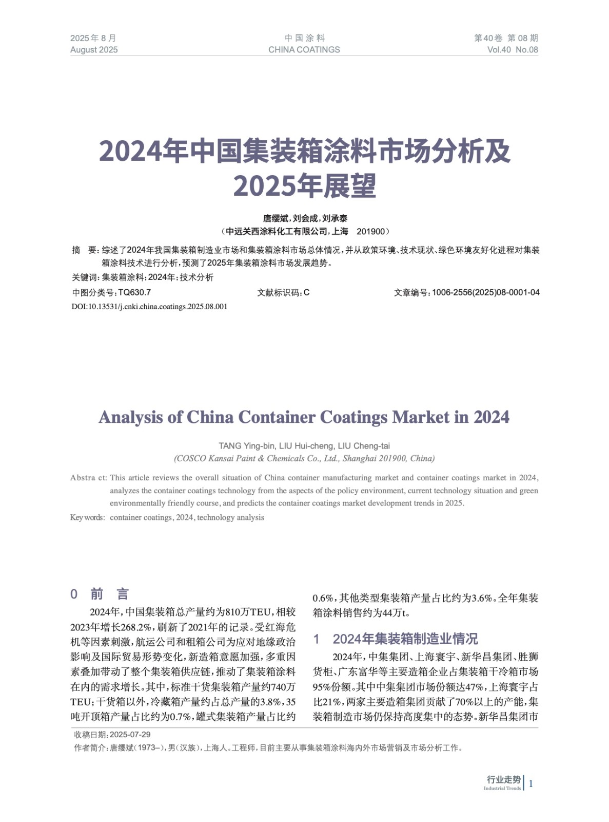 綜述了2024年我國集裝箱制造業(yè)市場和集裝箱涂料市場總體情況,并從政策環(huán)境、技術現狀、綠色環(huán)境友好化進程對集裝箱涂料技術進行分析,預測了2025年集裝箱涂料市場發(fā)展趨勢。
