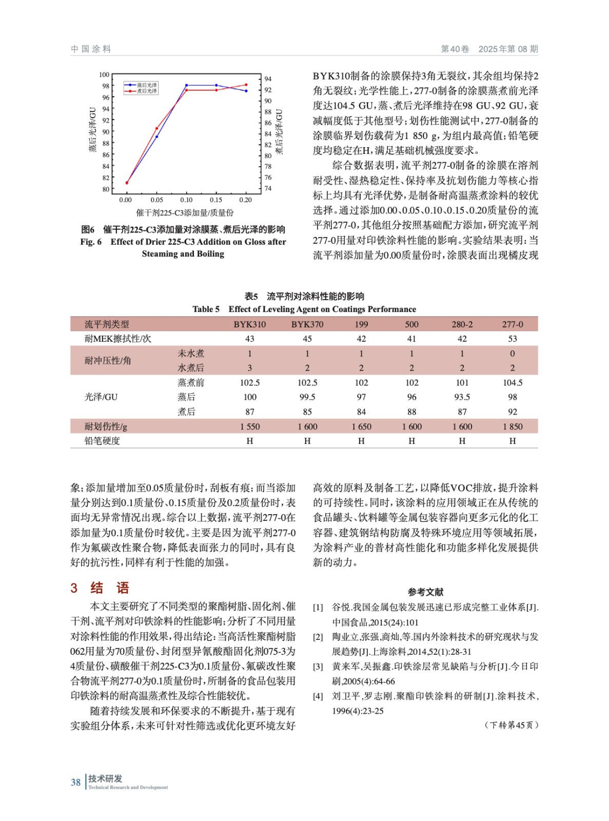 摘要:研究了不同型號的聚酯樹脂、固化劑、催干劑及流平劑對食品包裝用耐高溫蒸煮聚酯印鐵涂料性能的影響,并分析了各組分用量對其性能的作用效果。研究發(fā)現:高活性聚酯樹脂062型在70質量份時制備的涂膜耐高溫蒸煮性、耐化學溶劑性、抗沖壓開裂性及光澤穩(wěn)定性較優(yōu);4質量份封閉型異氰酸酯固化劑075-3與0.1質量份磺酸催干劑225-C3協同增強涂膜交聯密度,提升機械強度與固化效率;氟碳改性聚合物流平劑277-0在0.1質量份時有效消除涂膜橘皮現象與刮板痕跡,達到高平整度。
