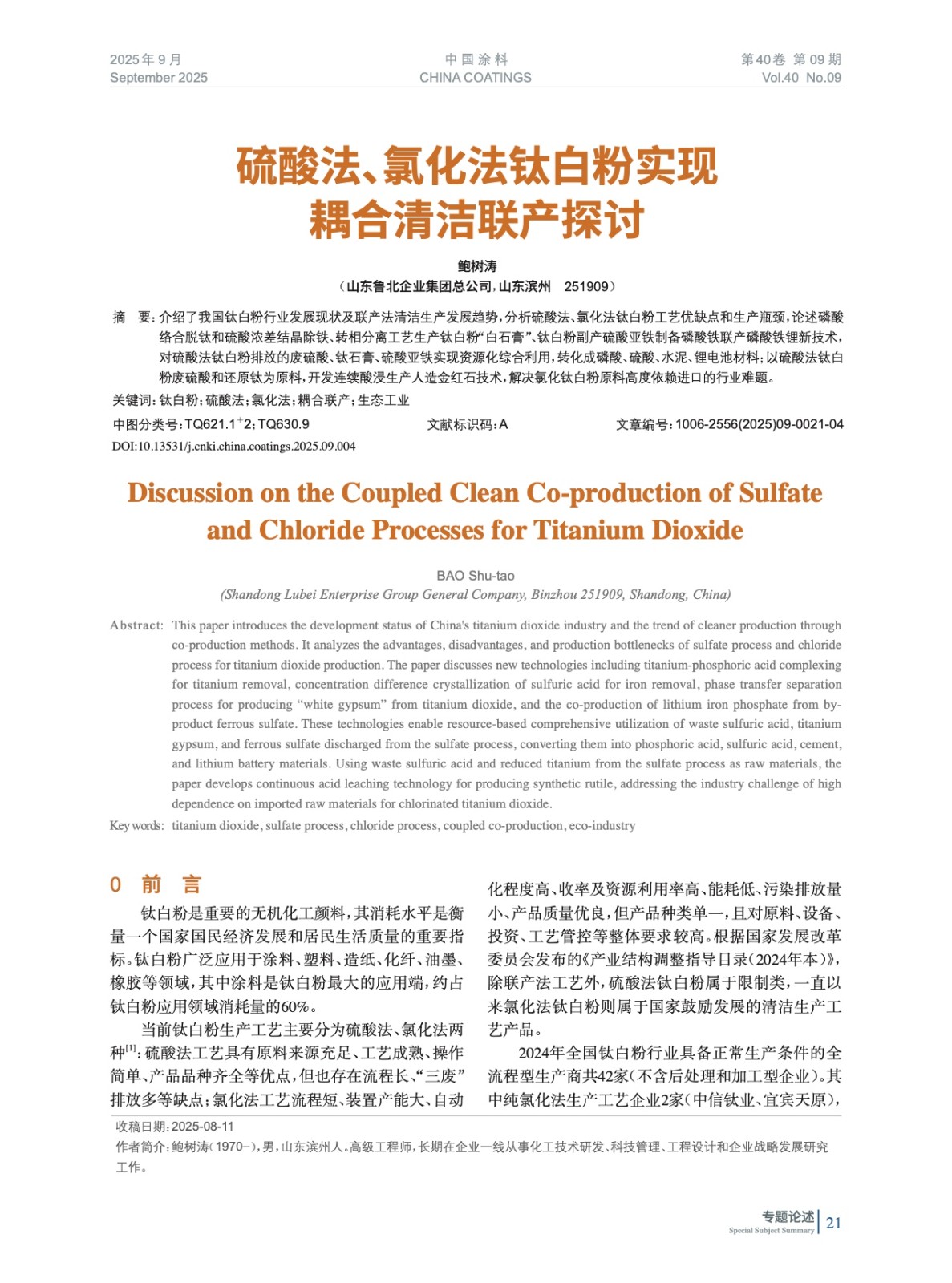 摘要:介紹了我國(guó)鈦白粉行業(yè)發(fā)展現(xiàn)狀及聯(lián)產(chǎn)法清潔生產(chǎn)發(fā)展趨勢(shì),分析硫酸法、氯化法鈦白粉工藝優(yōu)缺點(diǎn)和生產(chǎn)瓶頸,論述磷酸絡(luò)合脫鈦和硫酸濃差結(jié)晶除鐵、轉(zhuǎn)相分離工藝生產(chǎn)鈦白粉“白石膏”、鈦白粉副產(chǎn)硫酸亞鐵制備磷酸鐵聯(lián)產(chǎn)磷酸鐵鋰新技術(shù),對(duì)硫酸法鈦白粉排放的廢硫酸、鈦石膏、硫酸亞鐵實(shí)現(xiàn)資源化綜合利用,轉(zhuǎn)化成磷酸、硫酸、水泥、鋰電池材料;以硫酸法鈦白粉廢硫酸和還原鈦為原料,開(kāi)發(fā)連續(xù)酸浸生產(chǎn)人造金紅石技術(shù),解決氯化鈦白粉原料高度依賴進(jìn)口的行業(yè)難題。