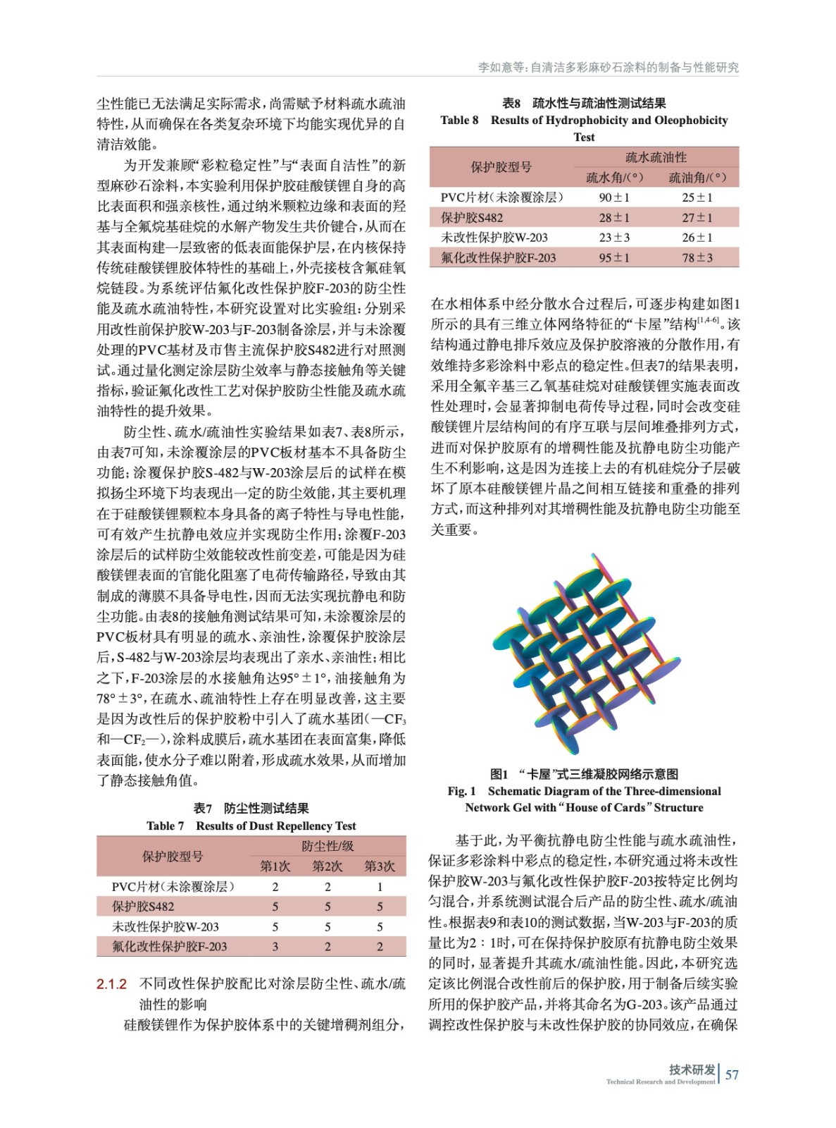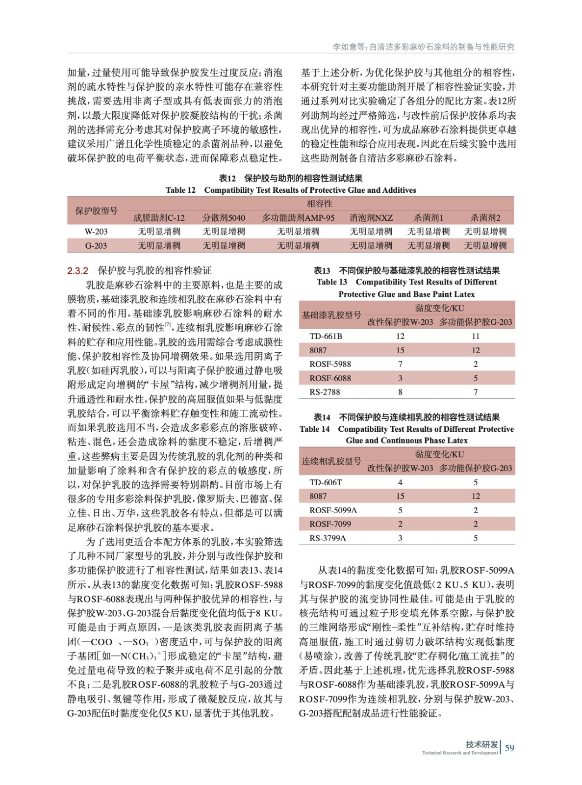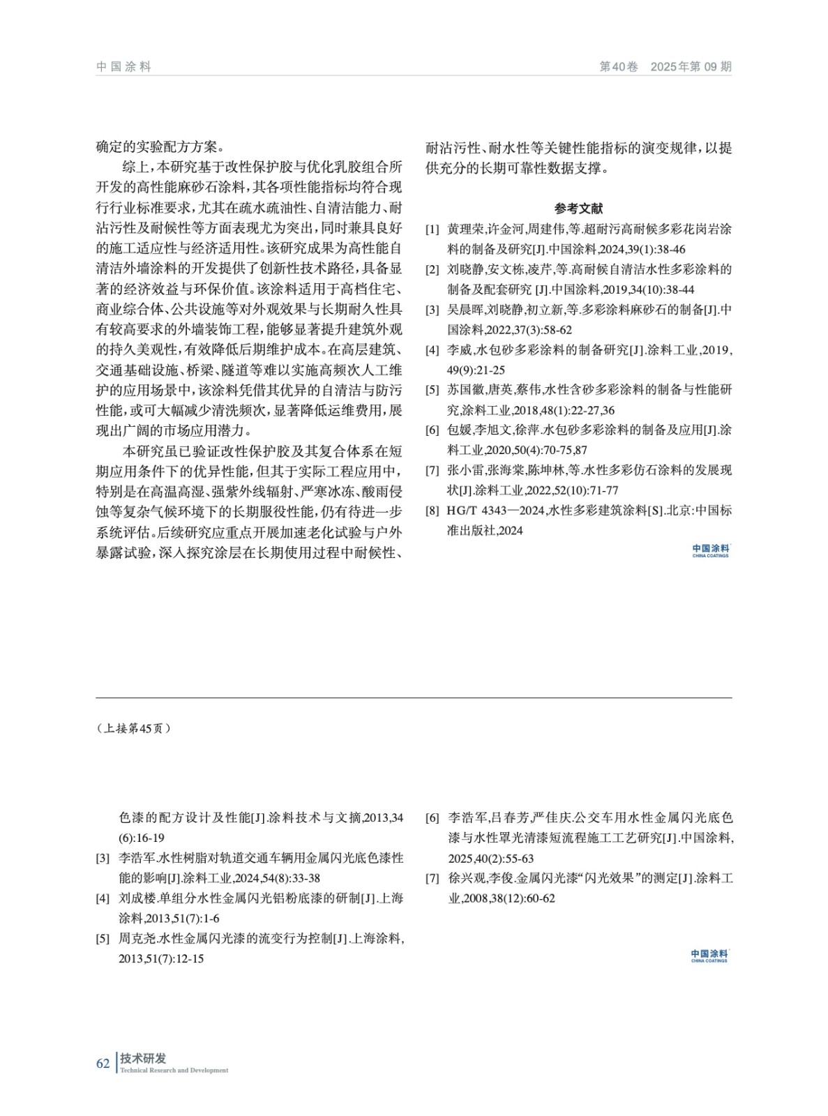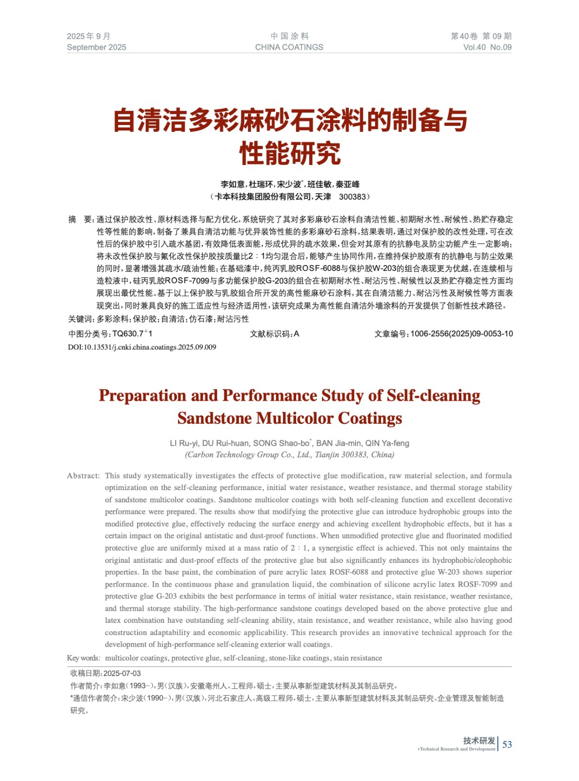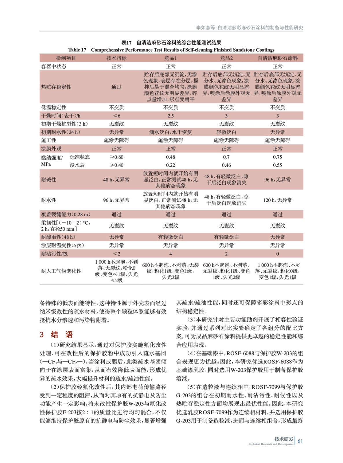 摘要:通過保護(hù)膠改性、原材料選擇與配方優(yōu)化,系統(tǒng)研究了其對多彩麻砂石涂料自清潔性能、初期耐水性、耐候性、熱貯存穩(wěn)定性等性能的影響,制備了兼具自清潔功能與優(yōu)異裝飾性能的多彩麻砂石涂料。結(jié)果表明,通過對保護(hù)膠的改性處理,可在改性后的保護(hù)膠中引入疏水基團(tuán),有效降低表面能,形成優(yōu)異的疏水效果,但會對其原有的抗靜電及防塵功能產(chǎn)生一定影響;將未改性保護(hù)膠與氟化改性保護(hù)膠按質(zhì)量比2∶1均勻混合后,能夠產(chǎn)生協(xié)同作用,在維持保護(hù)膠原有的抗靜電與防塵效果的同時,顯著增強其疏水/疏油性能;在基礎(chǔ)漆中,純丙乳膠ROSF-6088與保護(hù)膠W-203的組合表現(xiàn)更為優(yōu)越,在連續(xù)相與造粒液中,硅丙乳膠ROSF-7099與多功能保護(hù)膠G-203的組合在初期耐水性、耐沾污性、耐候性以及熱貯存穩(wěn)定性方面均展現(xiàn)出最優(yōu)性能。基于以上保護(hù)膠與乳膠組合所開發(fā)的高性能麻砂石涂料,其在自清潔能力、耐沾污性及耐候性等方面表現(xiàn)突出,同時兼具良好的施工適應(yīng)性與經(jīng)濟適用性,該研究成果為高性能自清潔外墻涂料的開發(fā)提供了創(chuàng)新性技術(shù)路徑。