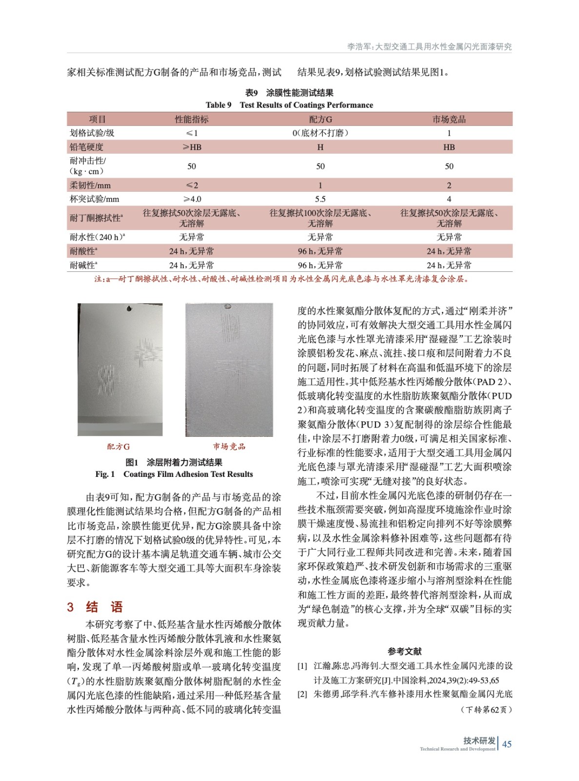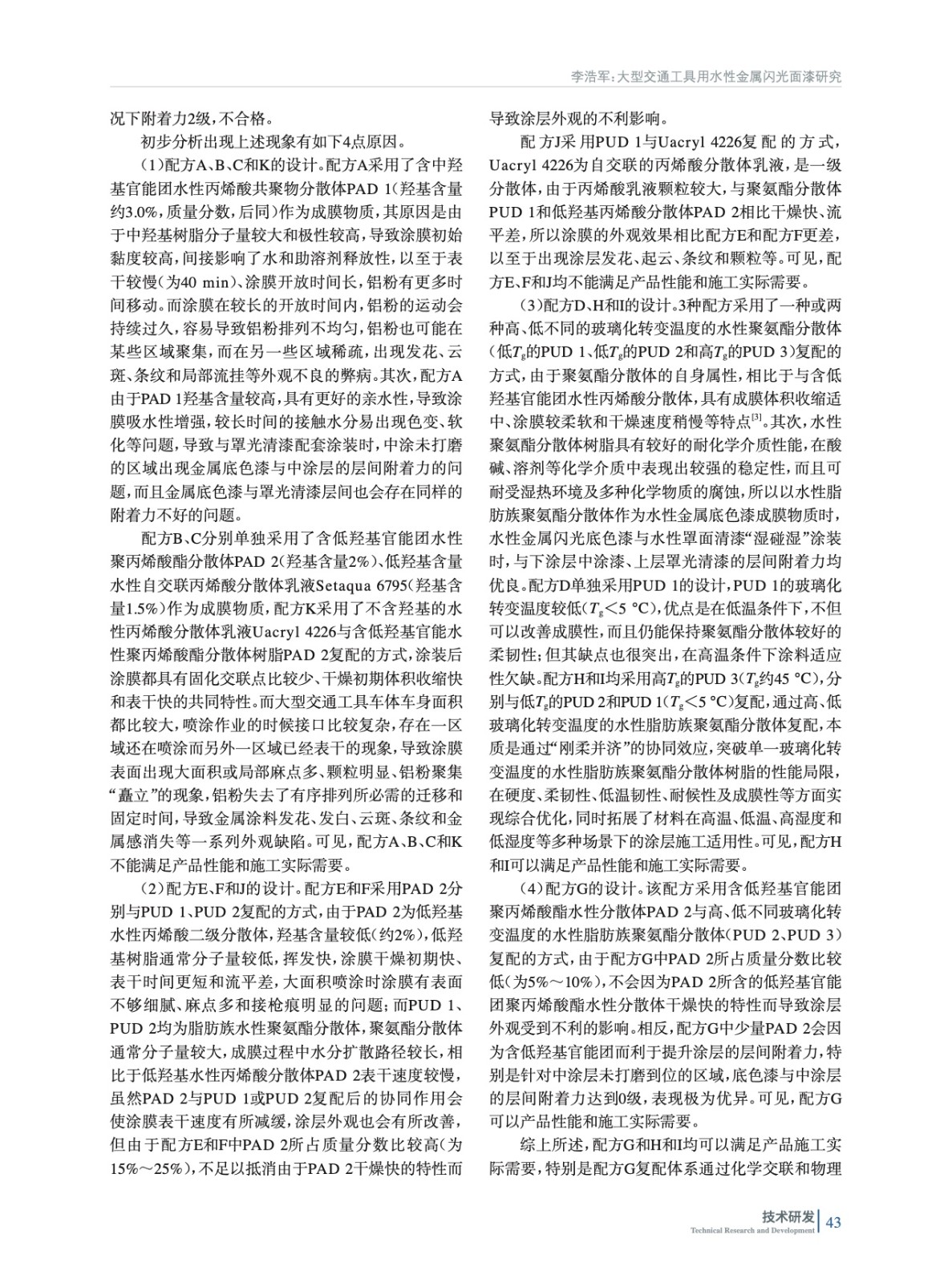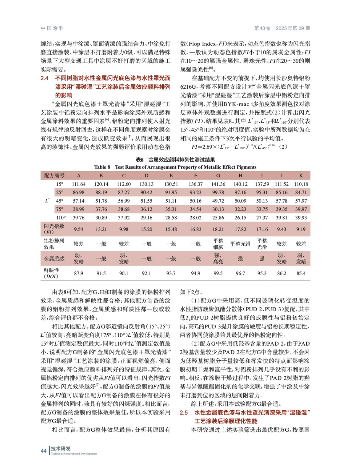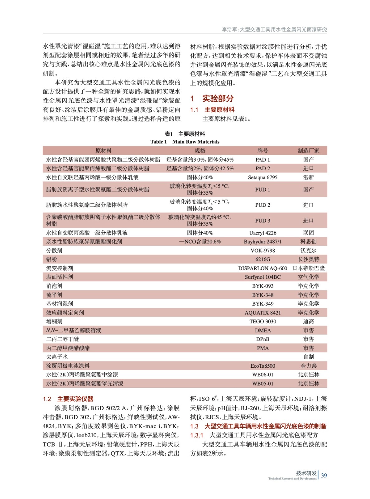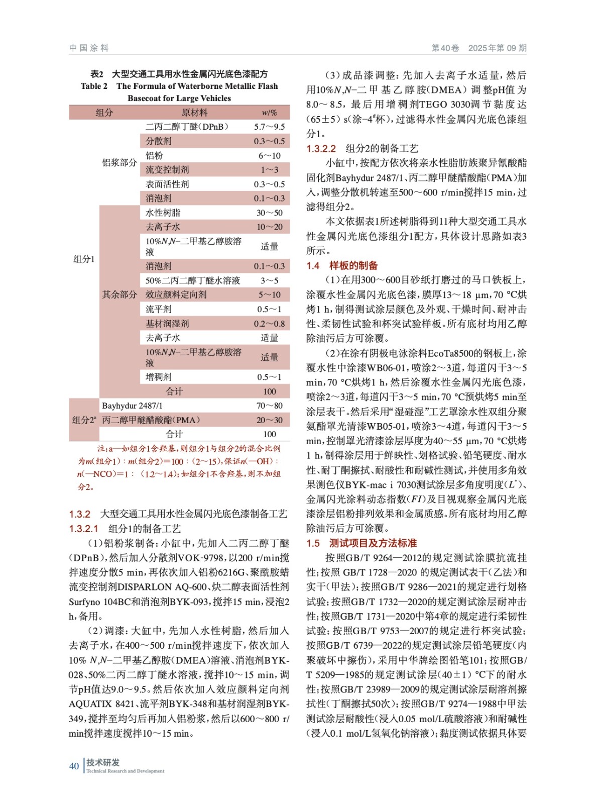 摘要:主要通過研究中、低羥基含量水性丙烯酸分散體樹脂、水性丙烯酸分散體乳液和高、低不同的玻璃化轉(zhuǎn)變溫度的水性聚氨酯分散體等水性樹脂對水性金屬閃光底色漆觸變指數(shù)、抗流掛性的影響,以及對水性金屬閃光底色漆與水性罩光面漆采用“濕碰濕”工藝時干燥性及涂裝后金屬效應(yīng)顏料排列外觀效果的影響,采用遞進式研究方法,制備了一種新型水性金屬閃光底色漆。該“濕碰濕”配套水性罩光清漆,整體配套面漆效果已通過GB/T 13492—2025《汽車用涂料》標(biāo)準中核心項目驗證。