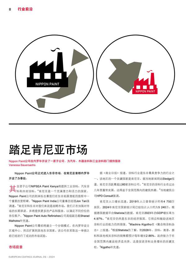Nippon Paint公司在內(nèi)羅畢開設(shè)了一家子公司,為汽車、木器涂料和工業(yè)涂料部門提供服務(wù)