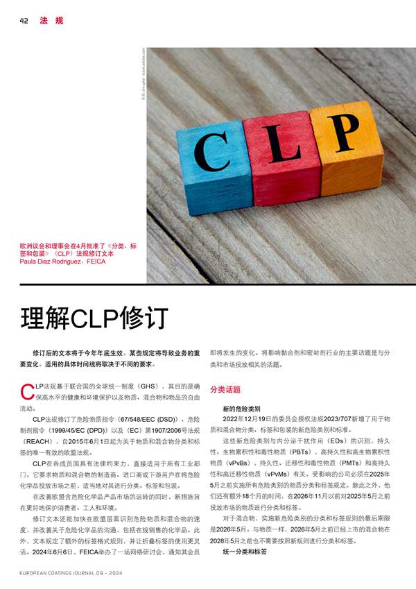 歐洲議會(huì)和理事會(huì)在4月批準(zhǔn)了《分類、標(biāo)簽和包裝》(CLP)法規(guī)修訂文本