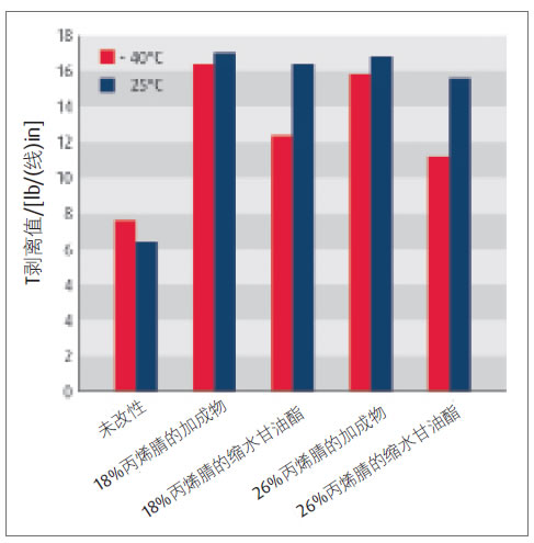 將該加成物配制成橡膠添加量為15份(份/100份樹脂)的單組分環(huán)氧膠黏劑,常溫貯存3個(gè)月后,根據(jù) ASTM-D1876,對其在電鍍鋅鋼上進(jìn)行T剝離強(qiáng)度試驗(yàn)。試驗(yàn)結(jié)果如圖7所示。與傳統(tǒng)的26%丙烯腈端羧基丁腈橡膠環(huán)氧加成物相比,在環(huán)氧加成物中加入CTB,在電鍍鋅鋼上的T剝離強(qiáng)度增加300%以上。這是低溫環(huán)境下膠黏劑增加韌性的一大進(jìn)步。
