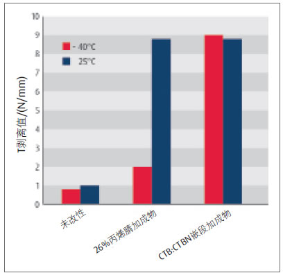 含有少量或未結(jié)合丙烯腈的RLP,玻璃化溫度較低,但不能和環(huán)氧樹脂混溶,貯存中會形成加成物,分離成兩相。美國專利7847026[7]詳述了一種新的加成物合成方法,這種加成物能與玻璃化溫度為-80 ℃的端羧基聚丁二烯(CTB)相容,用于改善低溫性能。