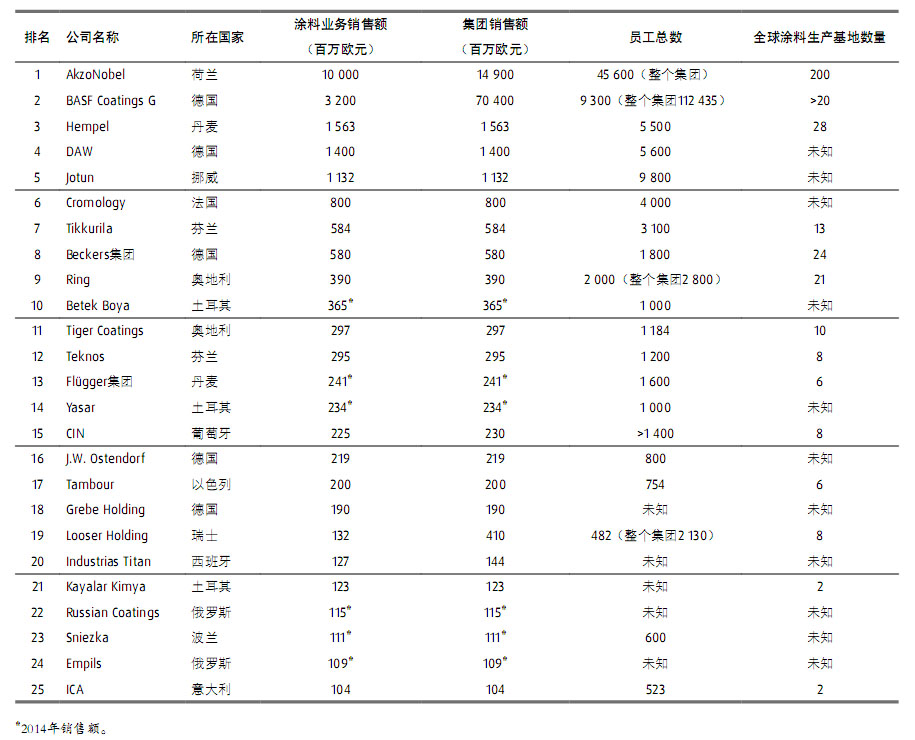 在歐洲,有很多涂料生產(chǎn)商積極活躍在涂料行業(yè)。《歐洲涂料雜志》根據(jù)各公司的收益情況,對總部設(shè)在歐洲大陸的歐洲涂料行業(yè)前25名進行了排行。