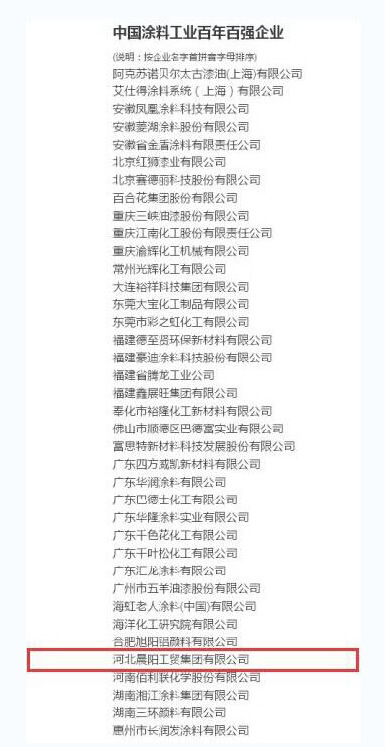10月10日,由中國涂料工業(yè)協(xié)會主辦的中國涂料工業(yè)百年百強評選活動結(jié)果公布,晨陽水漆當(dāng)選“中國涂料工業(yè)百年百強企業(yè)”榮譽稱號。