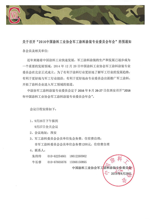 各會(huì)員及相關(guān)單位: 中涂協(xié)軍工涂料涂裝專業(yè)委員會(huì)定于 2016年9月26-27日 在 西安 召開“2016年中國涂料工業(yè)協(xié)會(huì)軍工涂料涂裝專業(yè)委員會(huì)年會(huì)”。 9月27日全天會(huì)議 2、會(huì)議地址:西安 3、軍工涂料委員會(huì)會(huì)員單位免會(huì)務(wù)費(fèi),住宿費(fèi)自理; 非軍工涂料委員會(huì)會(huì)員單位會(huì)務(wù)費(fèi)1200元,住宿費(fèi)自理 4、聯(lián)系人: 朱玲玲 010-62254661 18612260962 牛長睿 010-67605676 13366150895 中國涂料工業(yè)協(xié)會(huì)軍工涂料涂裝專業(yè)委員會(huì) 2016年8月29日