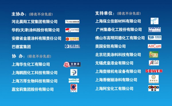 本次會議得到了河北晨陽工貿(mào)集團有限公司、華豹(天津)涂料股份有限公司、安徽省金盾涂料有限責任公司、巴德富集團、上海華生化工有限公司、上海鵬圖化工科技有限公司、上海萬厚生物科技有限公司、嘉寶莉集團股份有限公司、上海保立佳新材料有限公司、廣州集泰化工股份有限公司、佛山市高明同德化工有限公司、美國安凱有限公司、北京尼美涂料科技有限公司、上海壹維機電設備有限公司、上海香榭麗涂料有限公司、上海阿寶化工有限公司、山西亮龍涂料有限公司的大力支持。