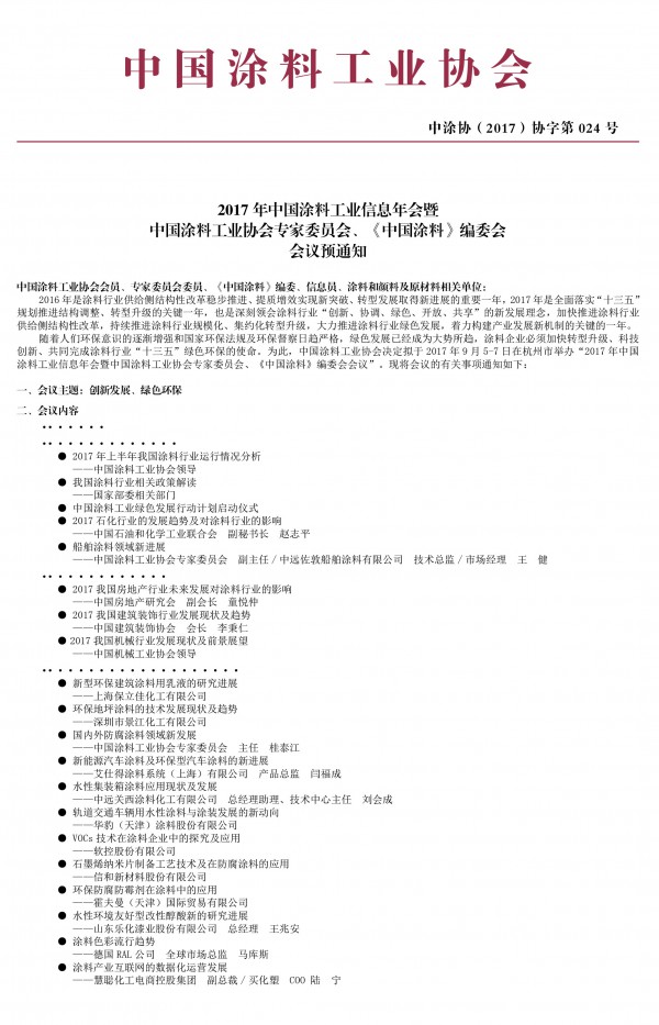 隨著人們環(huán)保意識(shí)的逐漸增強(qiáng)和國(guó)家環(huán)保法規(guī)及環(huán)保督察日趨嚴(yán)格,綠色發(fā)展已經(jīng)成為大勢(shì)所趨,涂料企業(yè)必須加快轉(zhuǎn)型升級(jí)、科技創(chuàng)新、共同完成涂料行業(yè)“十三五”綠色環(huán)保的使命。為此,中國(guó)涂料工業(yè)協(xié)會(huì)決定擬于2017年9月5-7日在杭州市舉辦“2017年中國(guó)涂料工業(yè)信息年會(huì)暨中國(guó)涂料工業(yè)協(xié)會(huì)專家委員會(huì)、《中國(guó)涂料》編委會(huì)會(huì)議”,屆時(shí)召開中國(guó)涂料工業(yè)協(xié)會(huì)水性工業(yè)涂料涂裝分會(huì)籌備會(huì)?,F(xiàn)將會(huì)議的有關(guān)事項(xiàng)通知如下:
