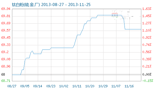 11月24日鈦白粉(硫.金.廠)商品指數(shù)為69.60,與11月23日持平,較周期內(nèi)最高點100.00點(2011-09-04)下降了30.40%,較2013年08月25日最低點68.74點上漲了1.25%。