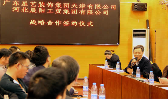廣東星藝裝飾集團(tuán)監(jiān)事長(zhǎng)冷忠在簽約儀式上發(fā)言