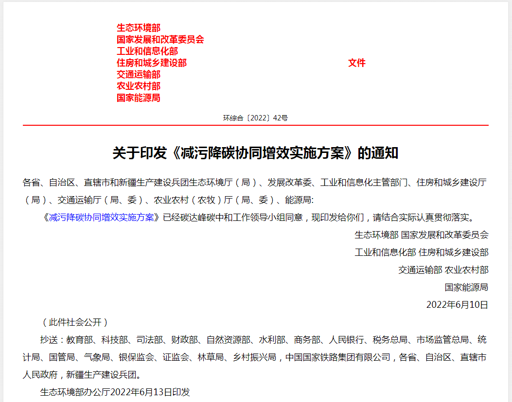 6月10日,生態(tài)環(huán)境部、發(fā)展改革委、工業(yè)和信息化部、住房城鄉(xiāng)建設部、交通運輸部、農業(yè)農村部、能源局聯合印發(fā)《減污降碳協(xié)同增效實施方案》(以下簡稱《方案》),深入貫徹落實黨中央、國務院關于碳達峰碳中和決策部署,落實新發(fā)展階段生態(tài)文明建設有關要求,對推動減污降碳協(xié)同增效作出系統(tǒng)部署。