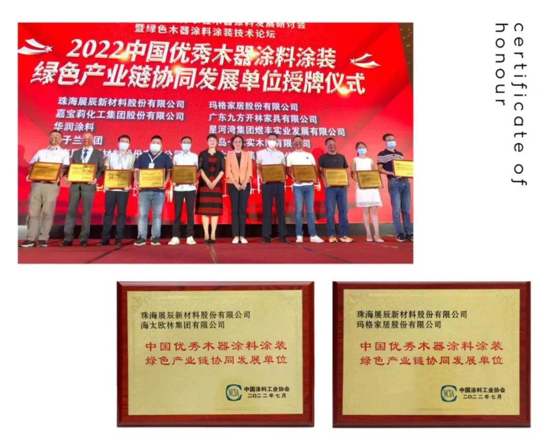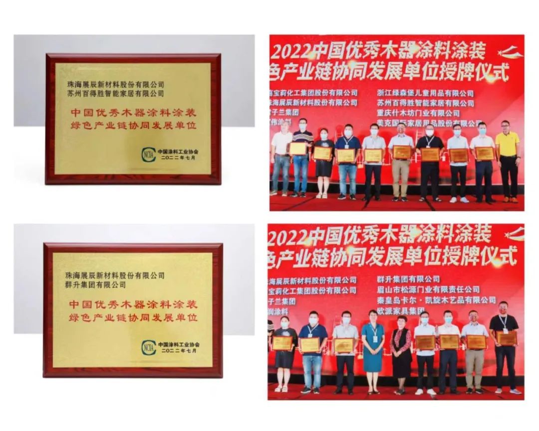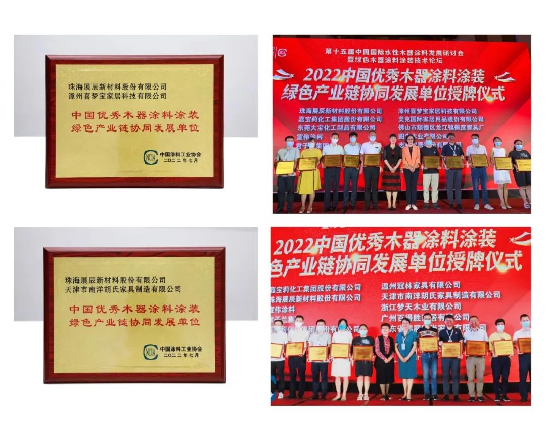 展辰新材與海太歐林、南洋胡氏家具、群升集團(tuán)、百得勝智能家居、喜夢(mèng)寶家居、瑪格家居一起,被評(píng)為“2022中國優(yōu)秀木器涂料涂裝綠色產(chǎn)業(yè)鏈協(xié)同發(fā)展單位”。