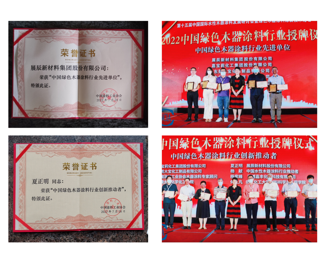 展辰新材料集團(tuán)股份有限公司榮膺“中國綠色木器涂料行業(yè)先進(jìn)單位”稱號(hào),同時(shí)展辰新材料集團(tuán)股份有限公司夏正明榮獲“中國綠色木器涂料行業(yè)創(chuàng)新推動(dòng)者”稱號(hào)。
