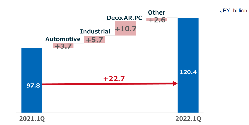 關(guān)西涂料各品類,在第一季度均進(jìn)行了提價(jià),尤其是汽車涂料和工業(yè)涂料也進(jìn)行了提價(jià)動(dòng)作。從環(huán)比上漲看,汽車涂料涂料收入增加37億日元,工業(yè)涂料增加57億日元,裝飾涂料增加107億日元。
