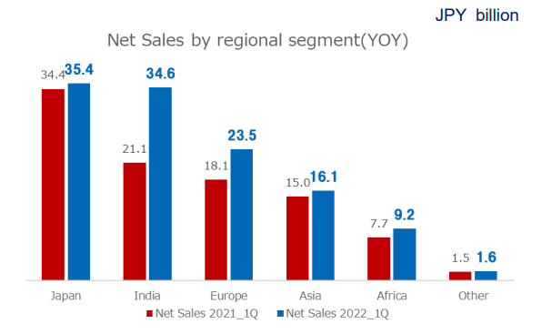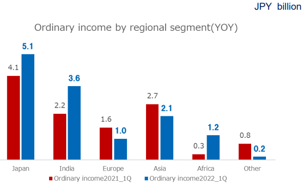 經(jīng)營(yíng)利潤(rùn)方面,日本經(jīng)營(yíng)利潤(rùn)達(dá)到51億日元,同比增長(zhǎng)24%,主要受外匯匯率影響較多;印度經(jīng)營(yíng)利潤(rùn)36億日元,同比增長(zhǎng)64%,主要原因同上,來(lái)自銷售量的增加;其他亞洲地區(qū)利潤(rùn)下滑至21億日元,下滑主要因?yàn)槌杀旧蠞q高于銷售價(jià)格導(dǎo)致;歐洲受俄烏戰(zhàn)爭(zhēng)和通貨膨脹的影響,經(jīng)營(yíng)利潤(rùn)同樣下降至10億日元,同比減少38%;非洲的經(jīng)營(yíng)利潤(rùn)突破10億日元,主要原因來(lái)自關(guān)西涂料在當(dāng)?shù)厥袌?chǎng)盈利能力的提升。