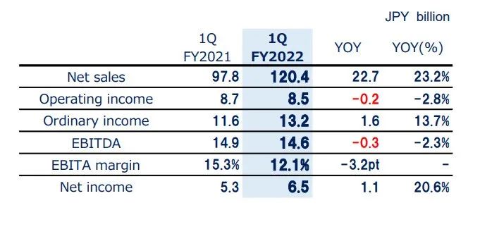 8月5日消息,關(guān)西涂料(KANSAI PAINT)發(fā)布2022年第一季度財(cái)報(bào)。盡管面臨原材料大幅的上漲,但關(guān)西涂料依舊在第一季度保持了23.2%的銷售收入增長(zhǎng)速度。第一季度,關(guān)西涂料完成銷售收入1204億日元(約60.22億人民幣,以下簡(jiǎn)稱“元”);經(jīng)營(yíng)利潤(rùn)收得85億日元(約4.24億元),同比下降2.8%;經(jīng)營(yíng)性息稅折舊攤銷前利潤(rùn)(EBITDA)132億日元(約6.6億元),同比增長(zhǎng)13.7%;同比增長(zhǎng)13.7%,歸母凈利潤(rùn)為64.50億日元(約3.23億元),實(shí)現(xiàn)同比增長(zhǎng)20.6%。