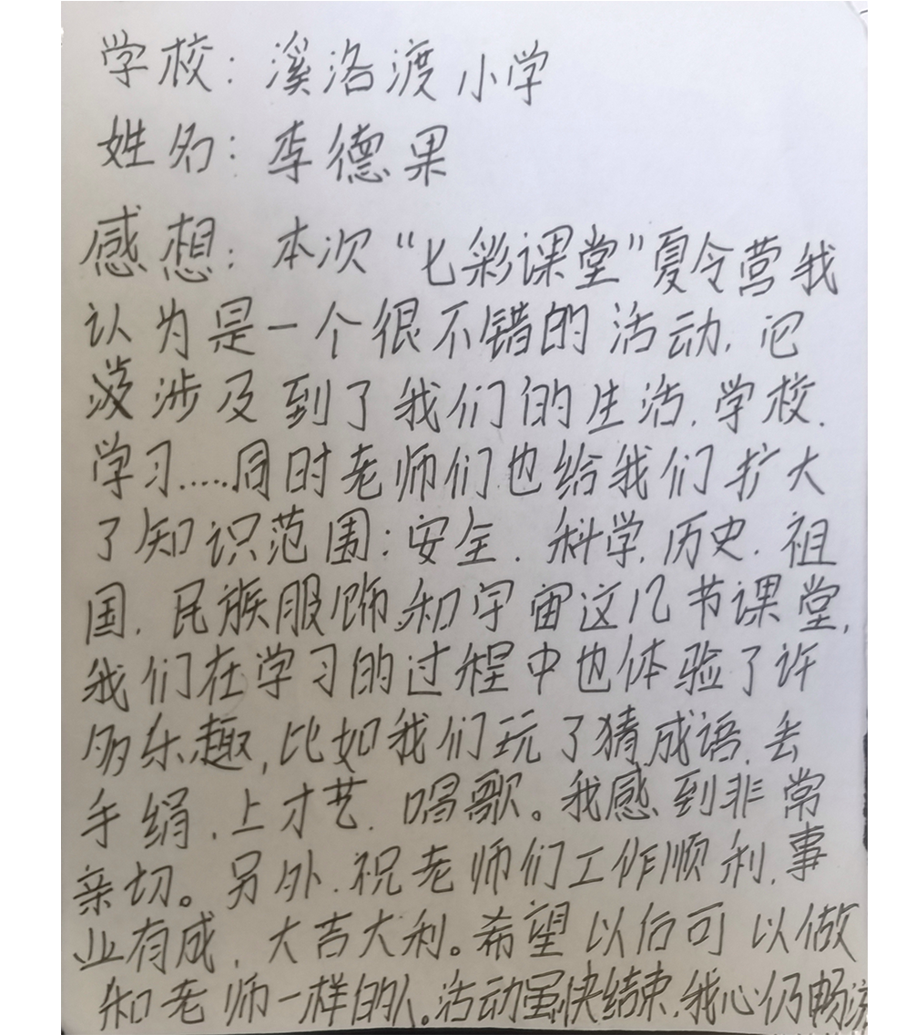 劉剛:非常感謝“七彩課堂”活動(dòng)給了我這次支教機(jī)會(huì),通過這次支教活動(dòng)感受頗多,真正體會(huì)到了作為一名志愿者的責(zé)任和義務(wù)。如果讓我說支教的感受,那就是艱苦并快樂著,平淡并享受著,付出并收獲著。人生有很多個(gè)驛站要走,每走一段都是一種領(lǐng)悟,讓我們帶著這些領(lǐng)悟,在為夢想而奮斗的征程上盡情揮灑,培育屬于我們自己的成功之花。