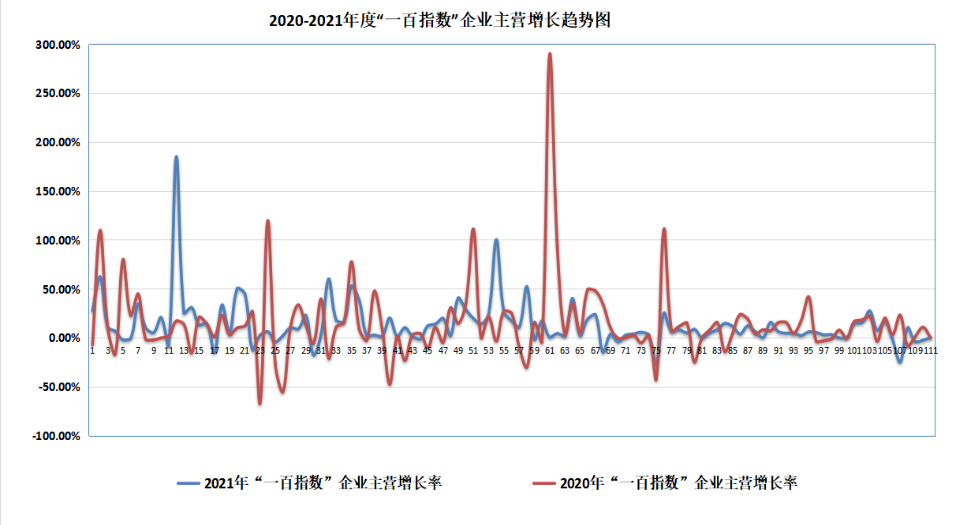 他還指出,從2020-2021年度“一百指數(shù)”企業(yè)主營增長趨勢來看,一百指數(shù)企業(yè)主營業(yè)務(wù)收入總和,相較于2020只有5.4%的增長來說,2021年取得了較為可喜的進步,同比前一年增長17.5%。