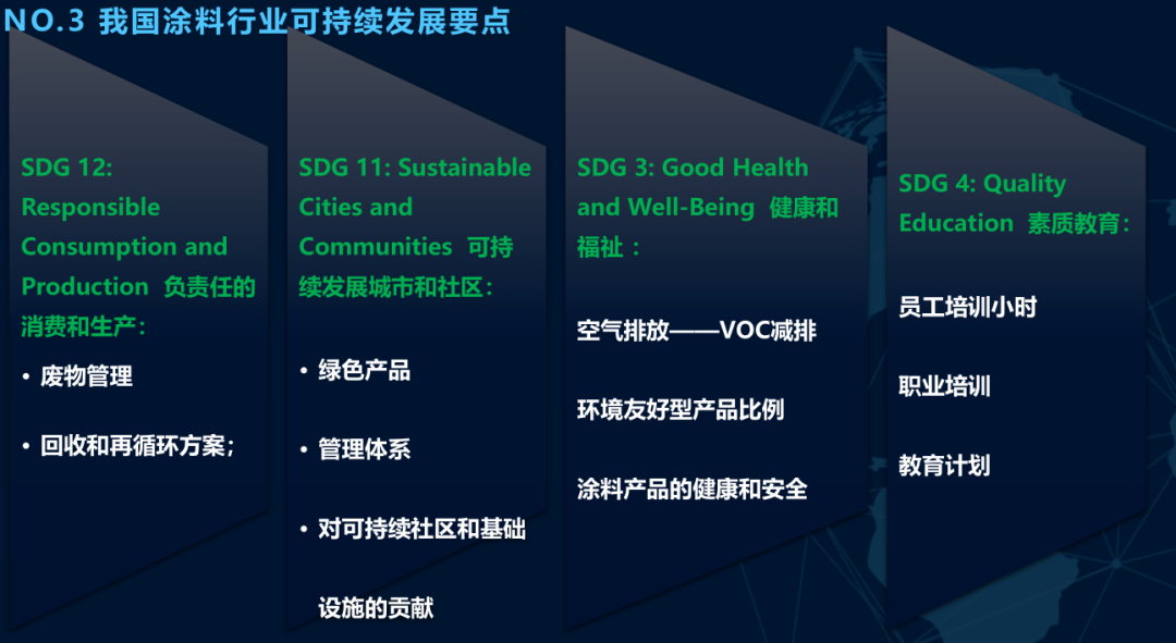 為此,中國涂料行業(yè)也要跟上全球涂料行業(yè)的發(fā)展步伐,要聚焦“負(fù)責(zé)任的消費和生產(chǎn)”、“可持續(xù)發(fā)展城市和社區(qū)”、“健康和福祉”、“素質(zhì)教育”這四大關(guān)鍵點進行發(fā)展。