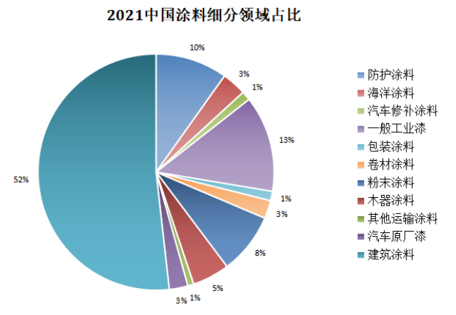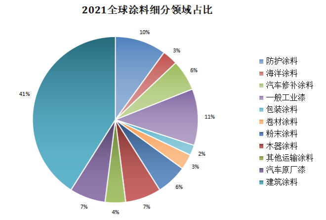 劉杰指出,從2021年中國與全球涂料行業(yè)細(xì)分對比來看,中國涂料行業(yè)細(xì)分領(lǐng)域占比與全球涂料細(xì)分領(lǐng)域占比并無太大差異,建筑涂料占比最大,其次是防護涂料。