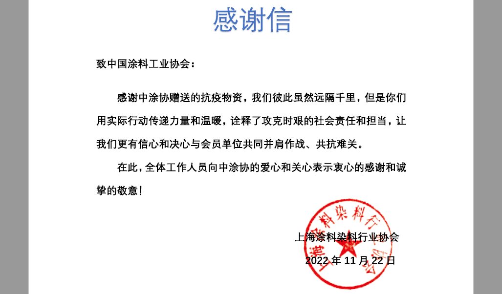 秉承“為企業(yè)發(fā)展服務(wù),為行業(yè)振興服務(wù)”的宗旨、竭誠為會員單位服務(wù)的理念,中國涂料工業(yè)協(xié)會時刻關(guān)注、關(guān)心涂料行業(yè)的一舉一動,面對本次洶涌而來的疫情,協(xié)會以實際行動助力防控,發(fā)揮社會團(tuán)體的使命擔(dān)當(dāng),展現(xiàn)作為涂料人“攜手同行、風(fēng)雨同舟”的大愛精神,為堅守在抗疫一線的涂料人送去關(guān)愛和溫暖,為他們繼續(xù)堅守崗位、逆行而上注入了溫暖、堅定的力量。相信在大家的共同努力下,一定能夠凝聚起眾志成城、全力以赴、共克時艱的強大力量,打贏本次疫情防控阻擊戰(zhàn)。