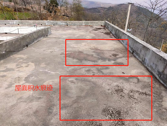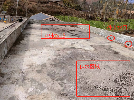 在考察的過(guò)程中,韓工發(fā)現(xiàn)小學(xué)是老舊屋面,大面積分布著龜裂紋,同時(shí)存在較大裂縫,漏水較為嚴(yán)重。整個(gè)屋面無(wú)找坡層,平整度較差,低洼處存在嚴(yán)重的積水現(xiàn)象,且落口管口全部被雜物堵死。