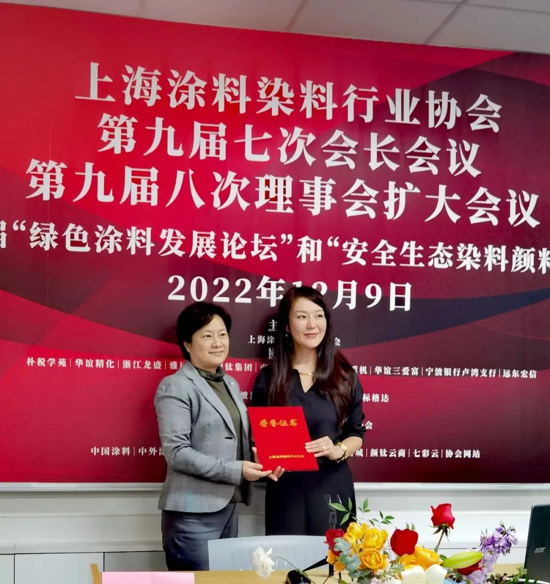 上海華誼精細(xì)化工有限公司黨委副書記總經(jīng)理楊紅妹向新任副會長圣敏賢頒發(fā)證書