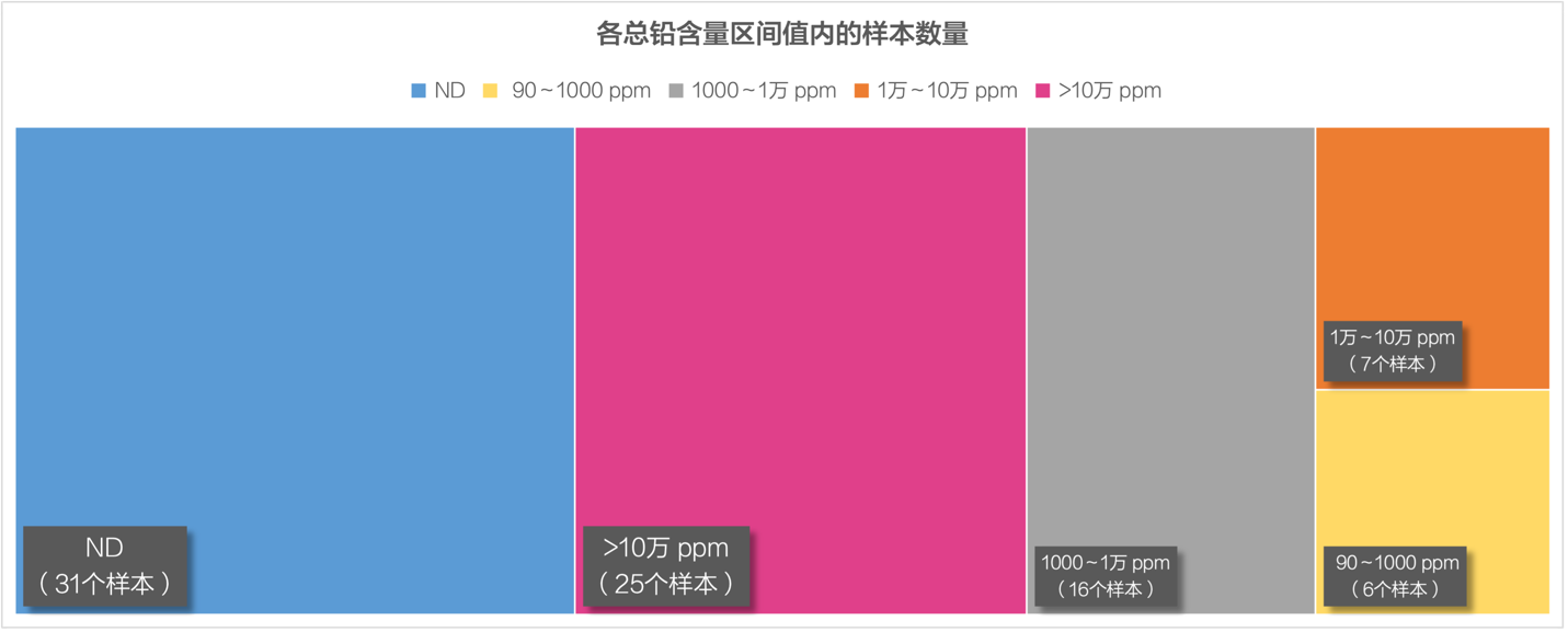 結果顯示,85個樣本中有31個未檢測出鉛成分(以ND表示),約占總樣本的36%,其余樣本的總鉛含量均高于90ppm。如圖1所示,僅6個樣本低于1000ppm(我國目前工業(yè)涂料標準中所規(guī)定的常用鉛限量值),其中總鉛含量最低的是103ppm。有16個樣本的總鉛含量在1000ppm至10000ppm之內(約占總樣本的19%),7個樣本的總鉛含量在10000ppm至10萬ppm之內(約占總樣本的8%),而多達25個樣本的總鉛含量高于10萬ppm(約占總樣本的29%),其中總鉛含量最高的是作為某兒童游樂設施,其值高達643900ppm。